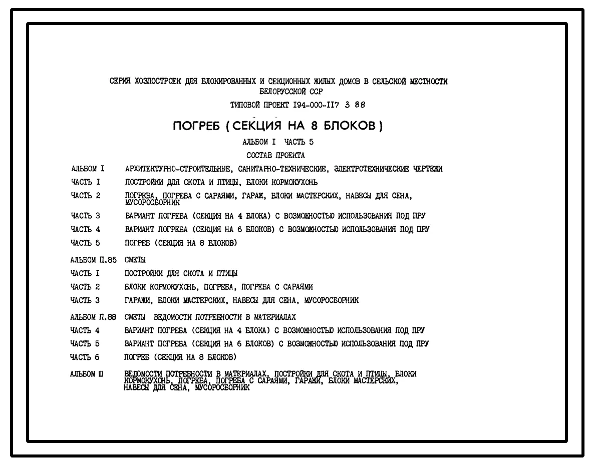 Типовой проект П-5-47(194-000-117.3.88) Бытовые помещения в погребе (секция на 8 блоков) серии хозпостроек для блокированных и секционных жилых домов, (убежище на 47 человек, размеры убежища 17,1м на 6м, режимы вентиляции 1,2).