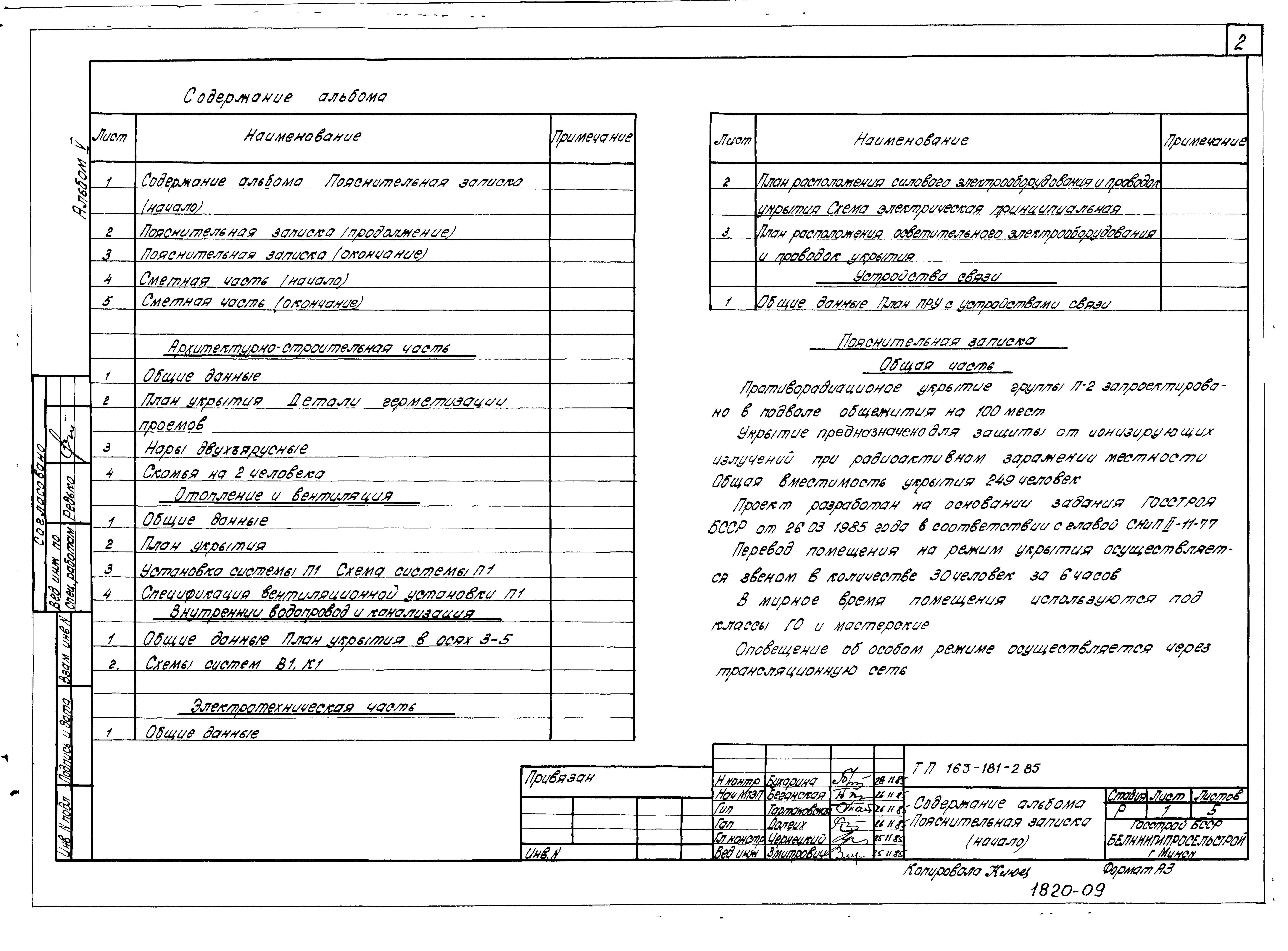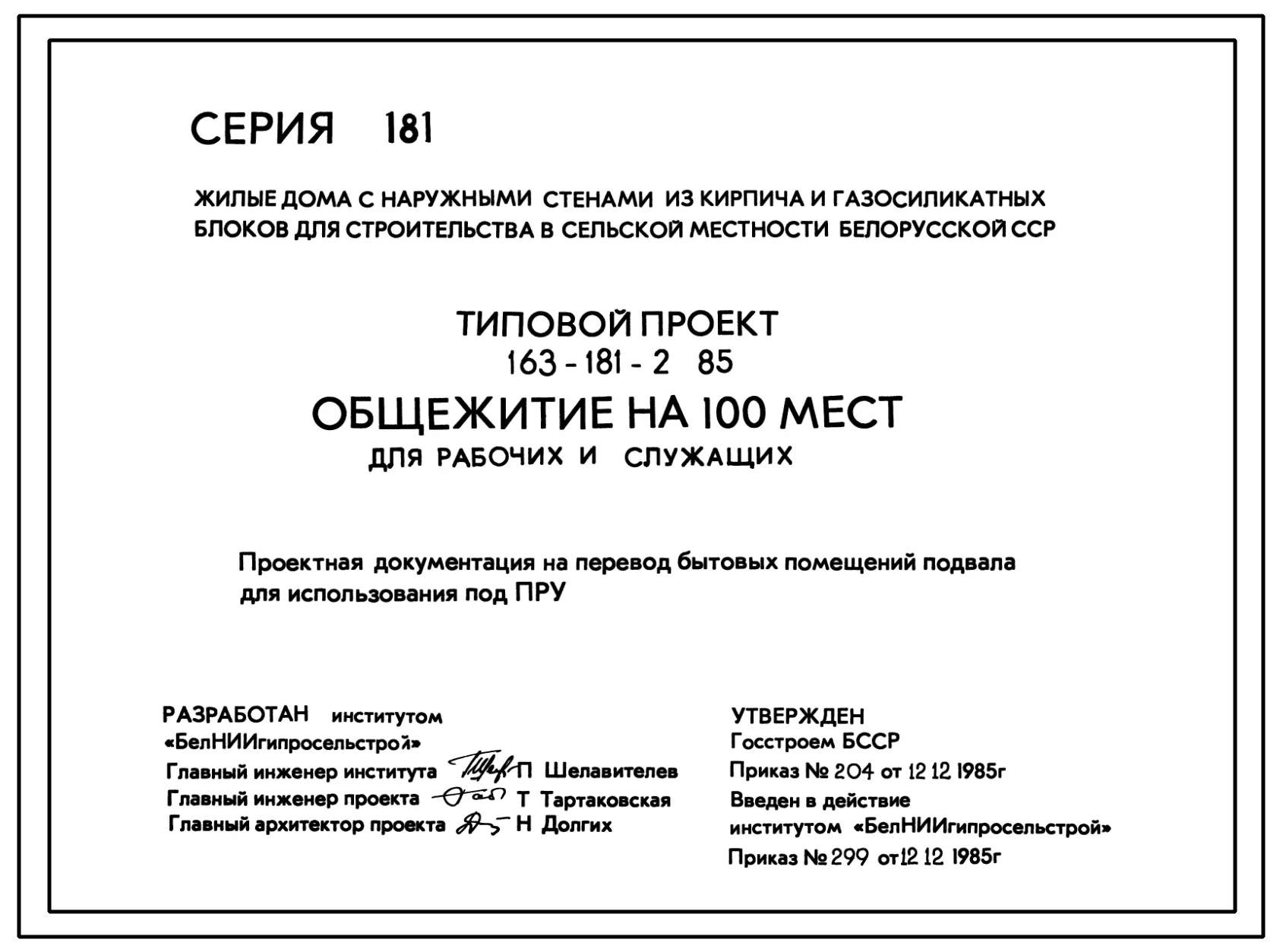 Типовой проект П-2-249(163-181-2.85) Бытовые помещения в подвале общежития на 100 мест для рабочих и служащих, (убежище на 249 человек, размеры убежища 20,7м на 16,5м, режимы вентиляции 1,2).
