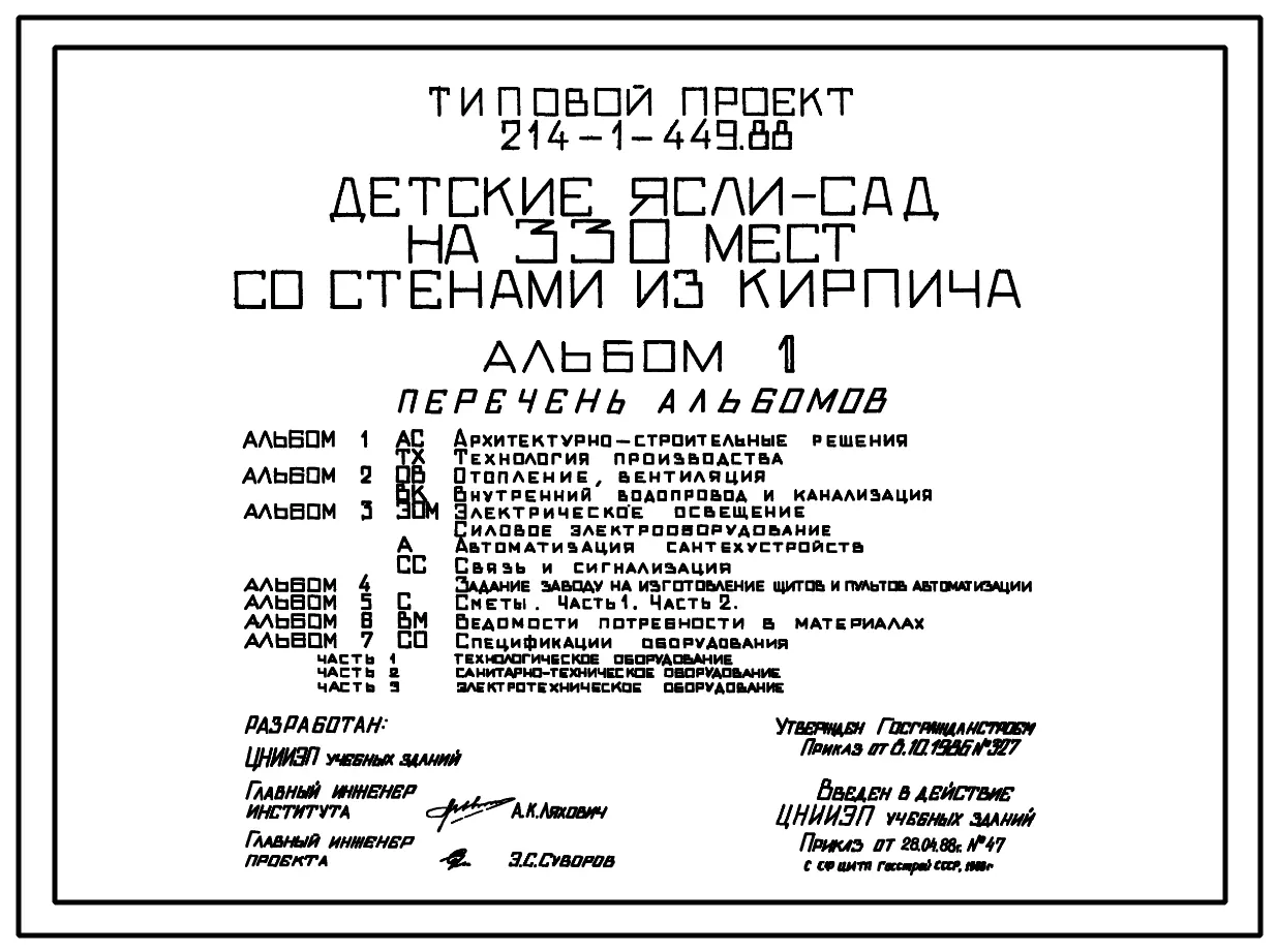 Типовой проект 214-1-449.88 Детские ясли-сад на 330мест. Здание двух-, трехэтажное. Стены из кирпича.