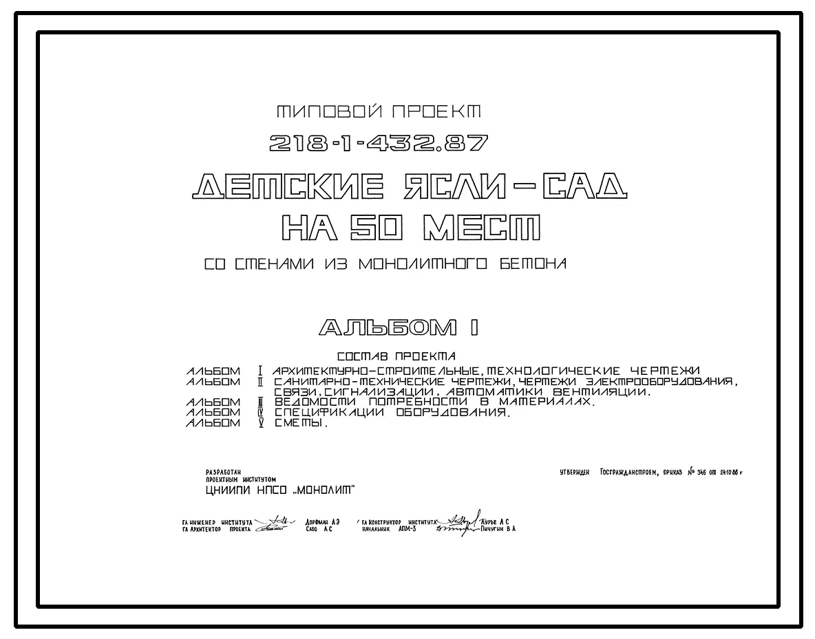 Типовой проект 218-1-432.87 Детские ясли-сад на 50 мест. Здание одноэтажное. Стены из монолитного бетона.