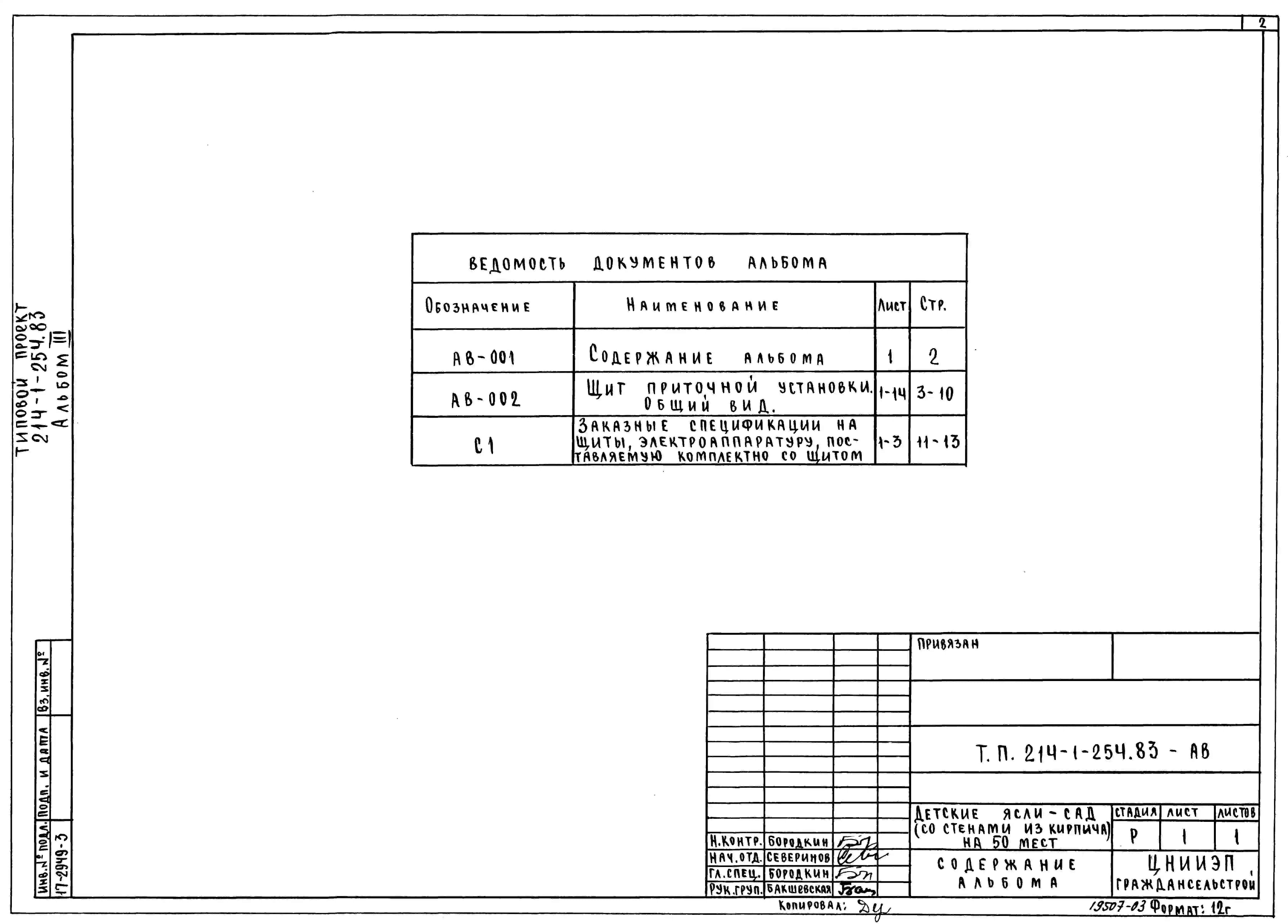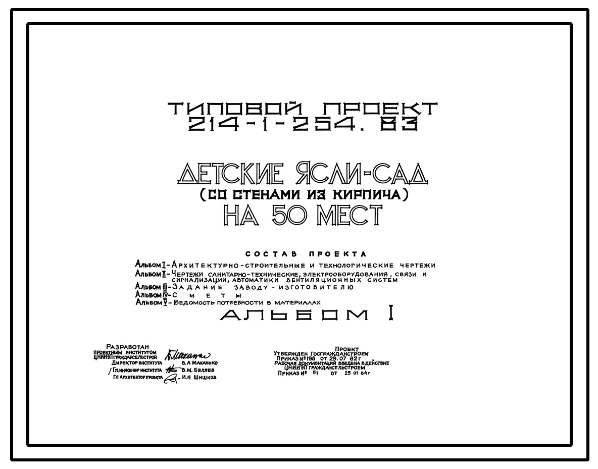 Типовой проект 214-1-254.83 Детские ясли - сад на 50 мест. Здание одноэтажное. Стены из кирпича.