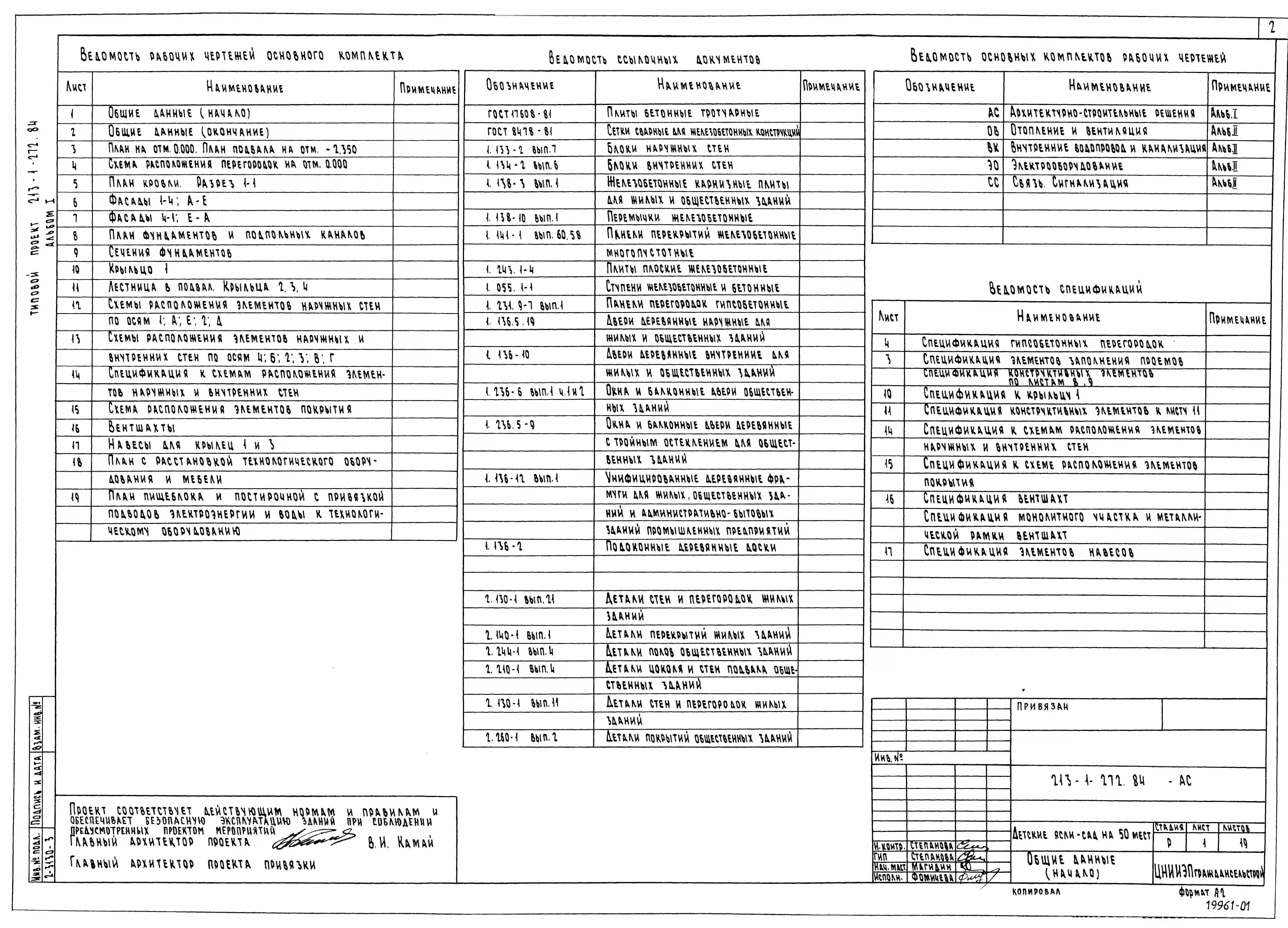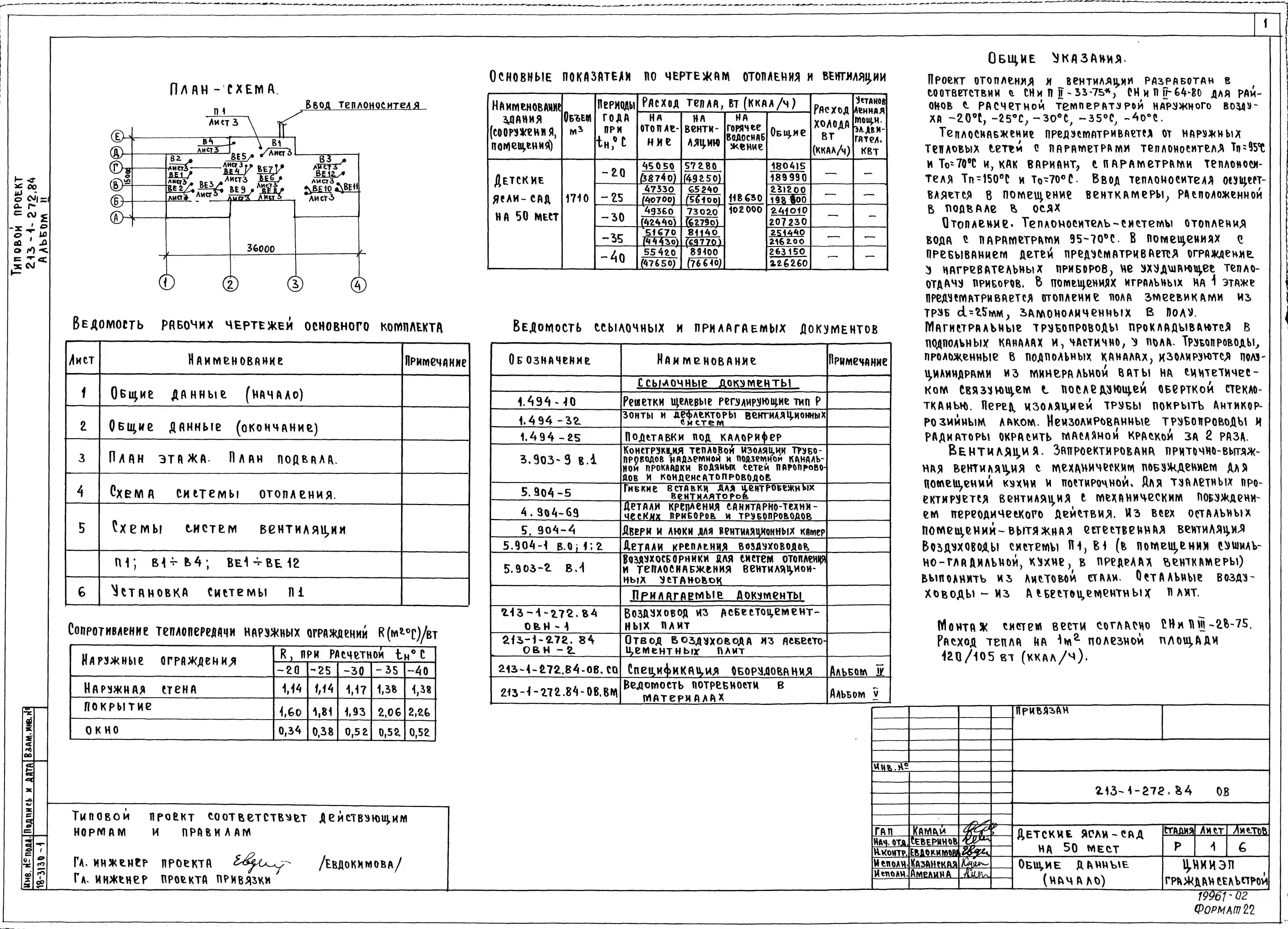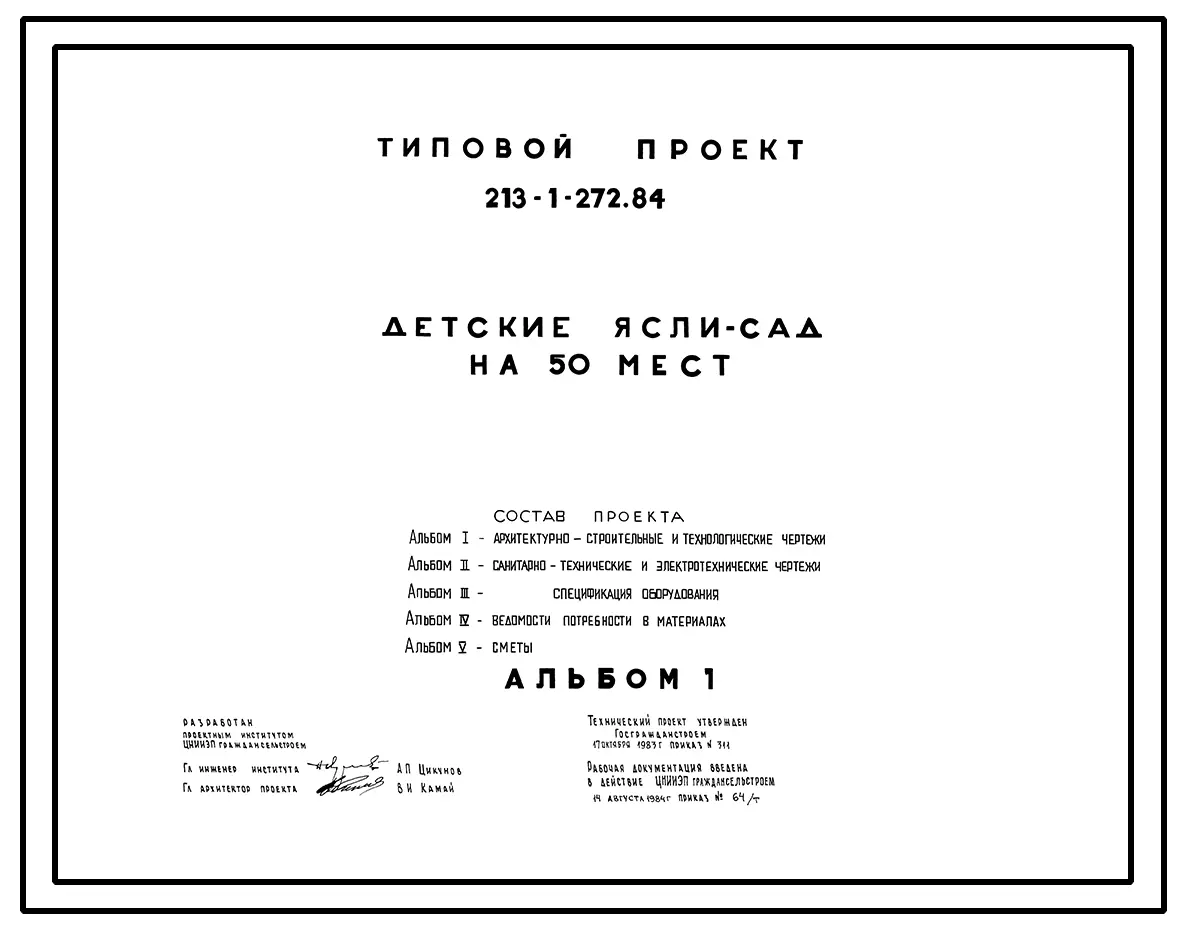 Типовой проект 213-1-272.84 Детские ясли-сад на 50 мест. Здание одноэтажное. Стены из легкобетонных блоков.