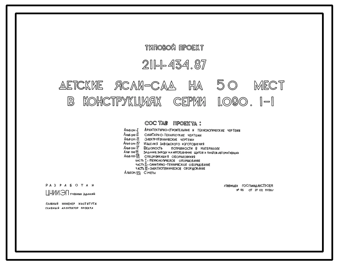 Типовой проект 211-1-434.87 Детские ясли-сад на 50 мест. Здание одноэтажное. Стены из однослойных легкобетонных панелей по серии 1.090.1-1.