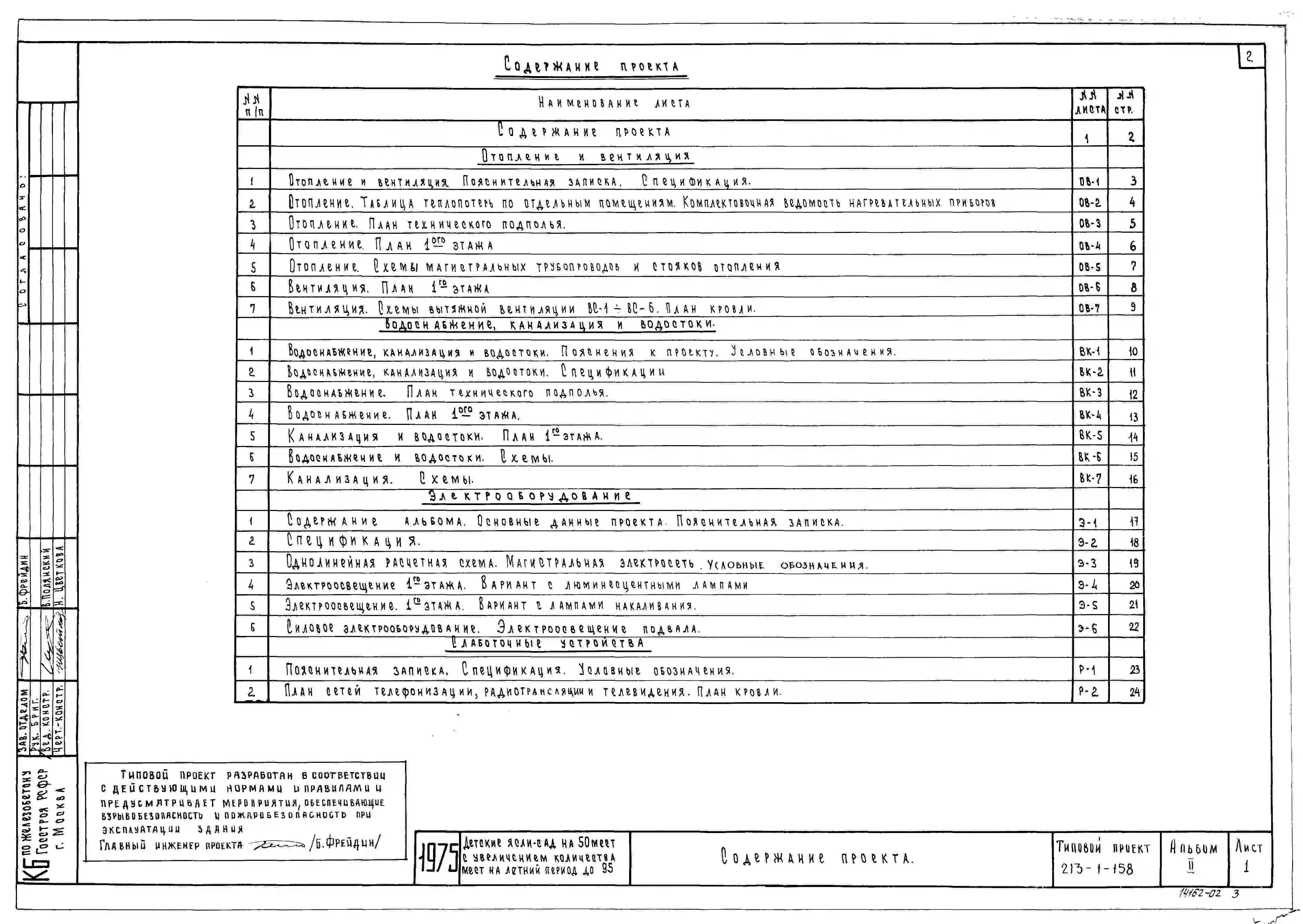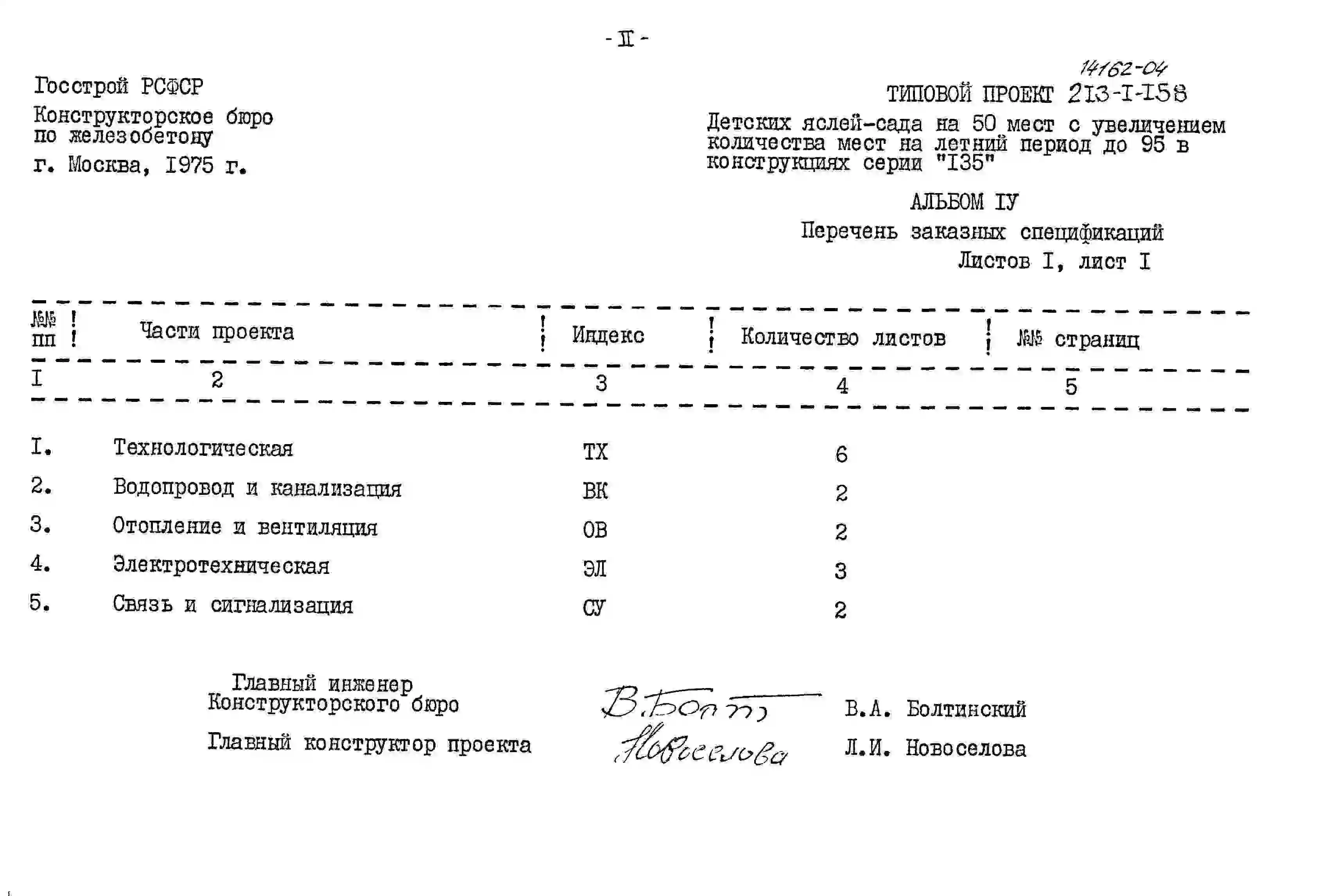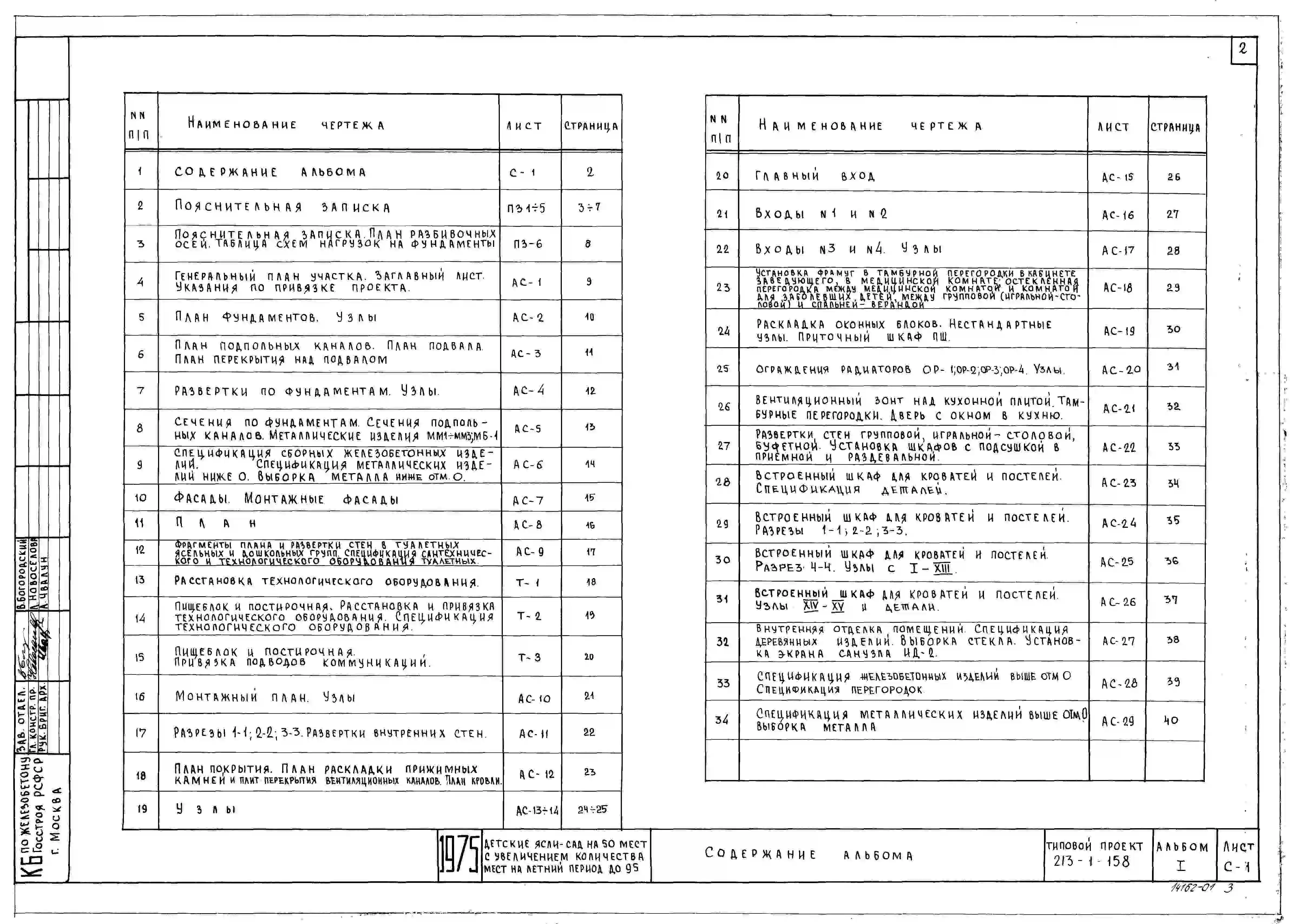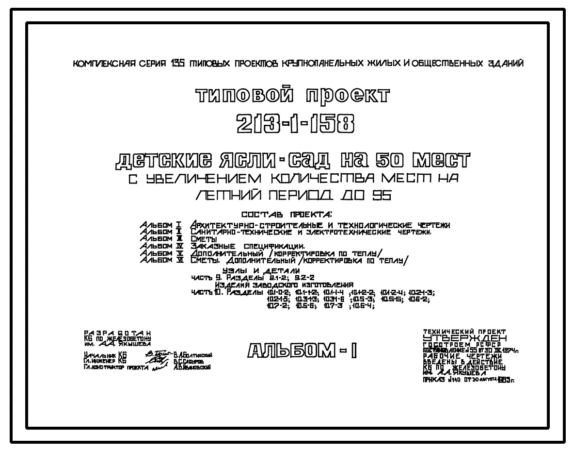 Типовой проект 213-1-158 Детские ясли-сад на 50 мест с увеличением количества мест на летний период до 95. Здание одноэтажное. Конструкция серии 135. Стены из однослойных легкобетонных панелей.