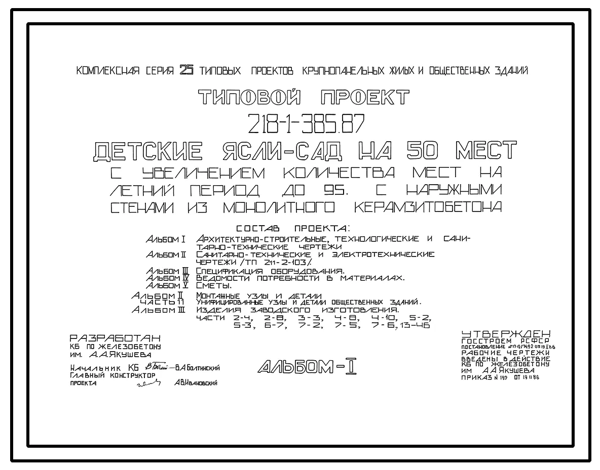 Типовой проект 218-1-385.87 Детские ясли-сад на 50 мест с увеличением количества мест на летний период до 95. Здание одноэтажное. Стены из монолитного керамзитобетона.