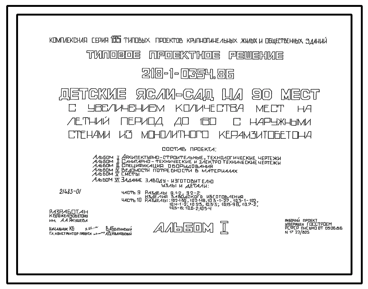 Типовой проект 218-1-0354.86 Детские ясли-сад на 90 мест с увеличением количества мест на летний период до 180. Здание одноэтажное. Стены из монолитного керамзитобетона.