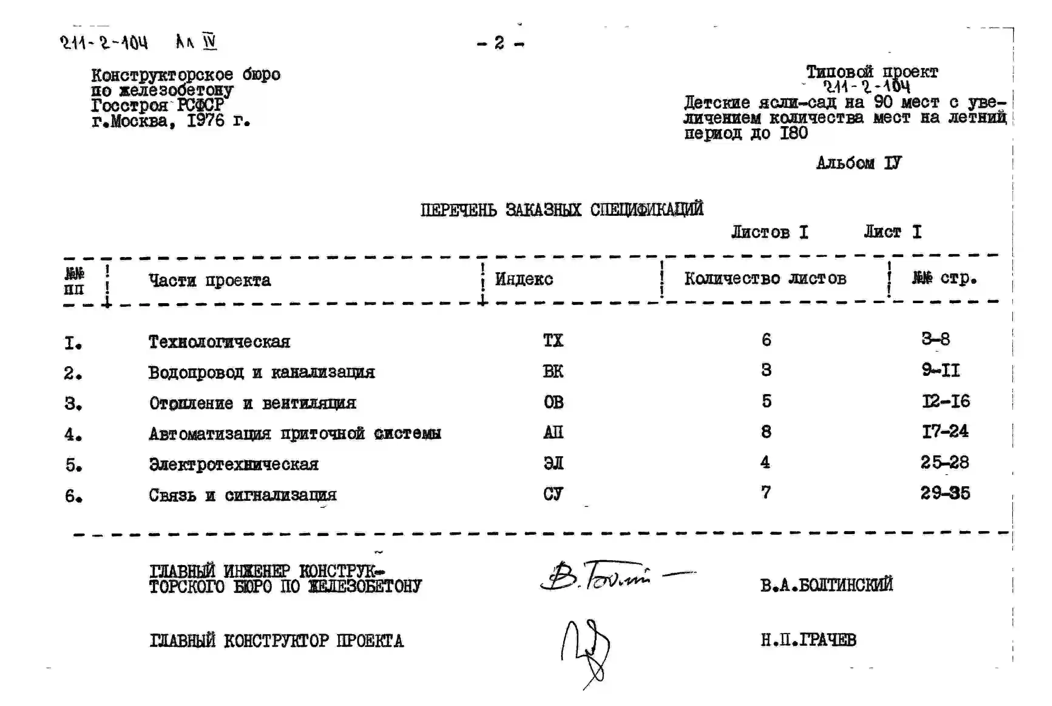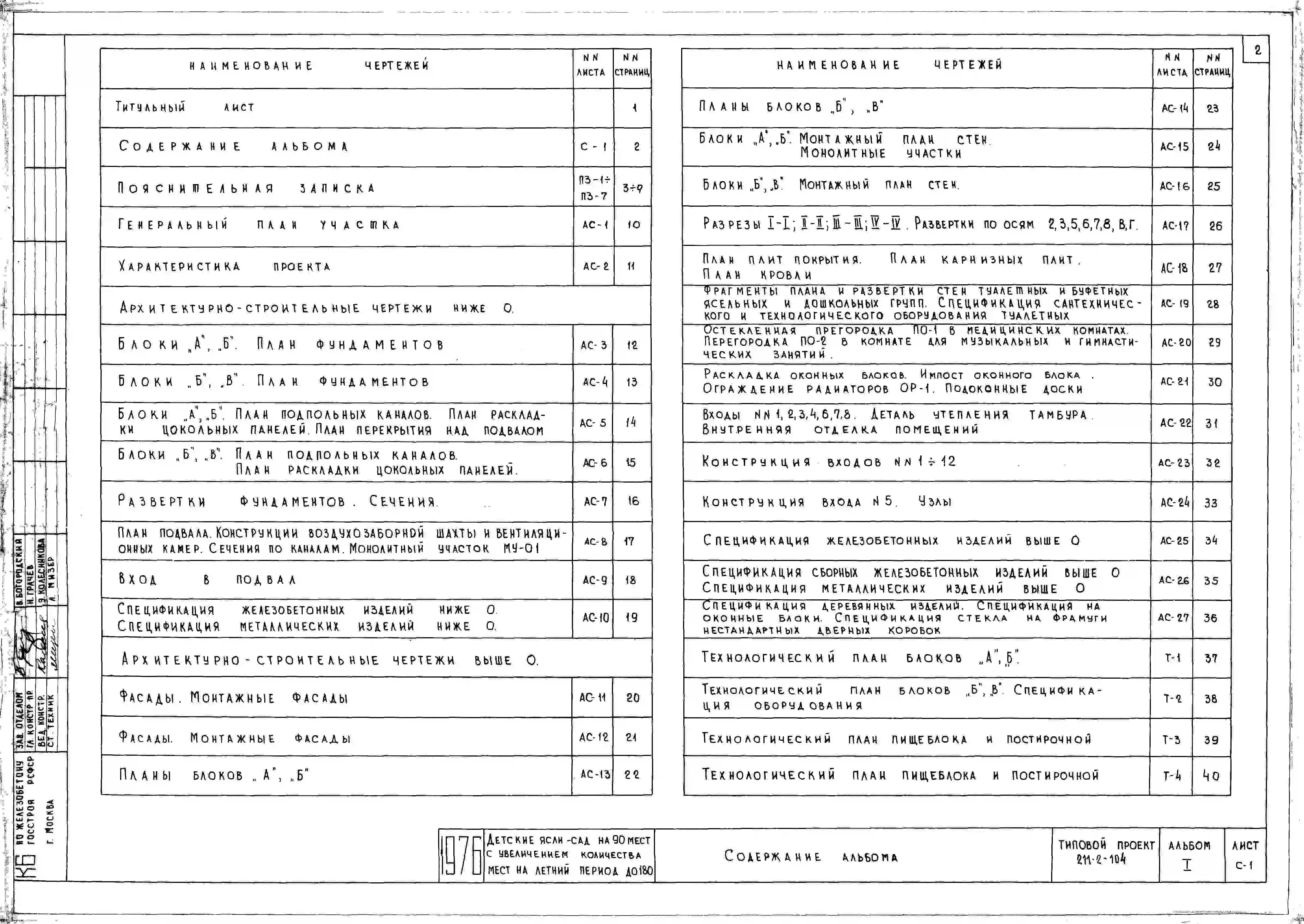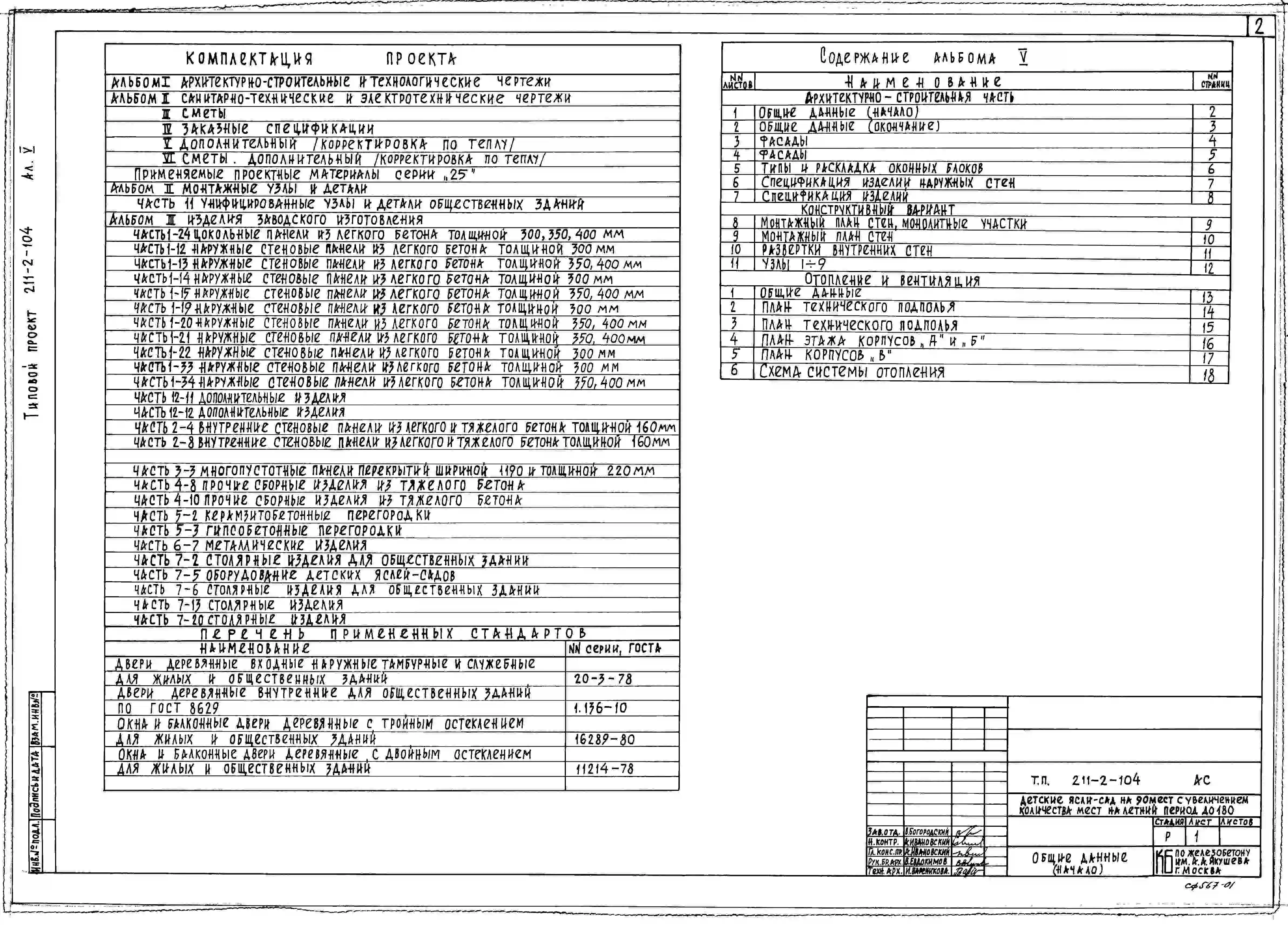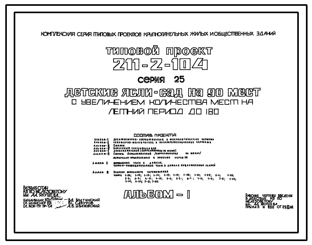 Типовой проект 211-2-104 Детские ясли-сад на 90 мест с увеличением количества мест на летний период до 180. Здание одноэтажное. Конструкции серии 25. Стены из однослойных легкобетонных панелей.