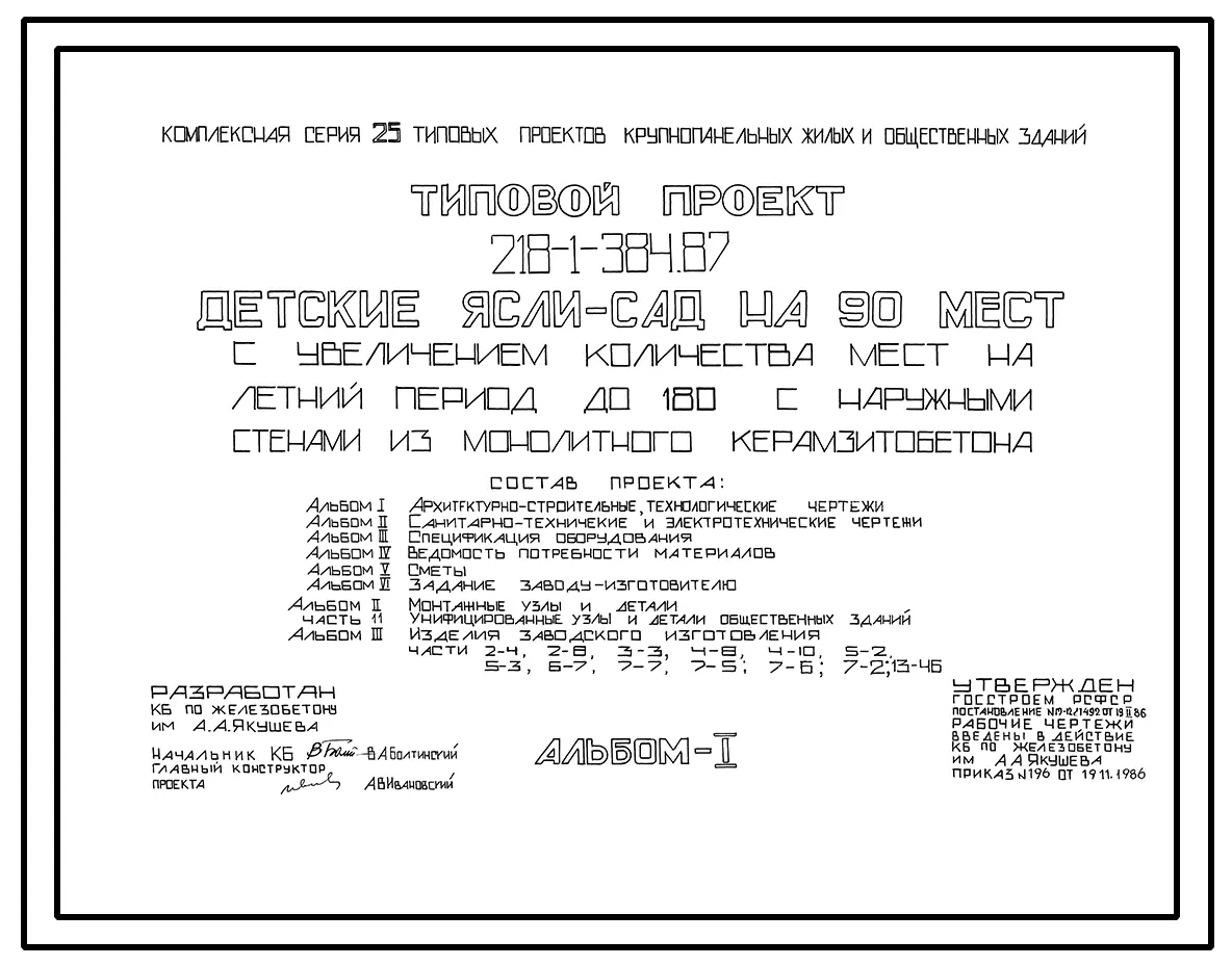 типовой проект 218-1-384.87 Детские ясли-сад на 90 мест с увеличением количества мест на летний период до 180. Здание одноэтажное. Стены из монолитного керамзитобетона.