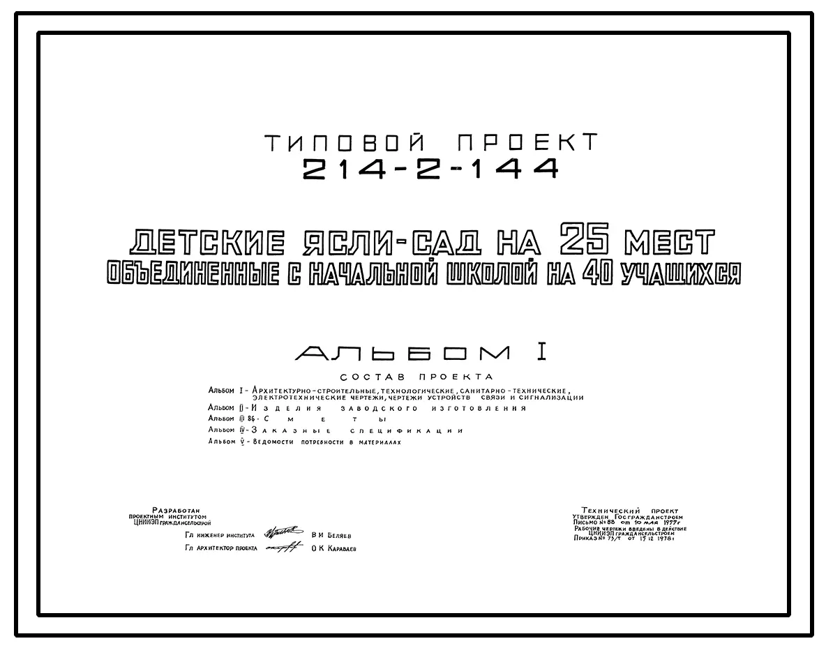 Типовой проект 214-2-144 Детские ясли–сад на 25 мест, объединенные с начальной школой на 40 учащихся. Здание одноэтажное. Стены из кирпича.
