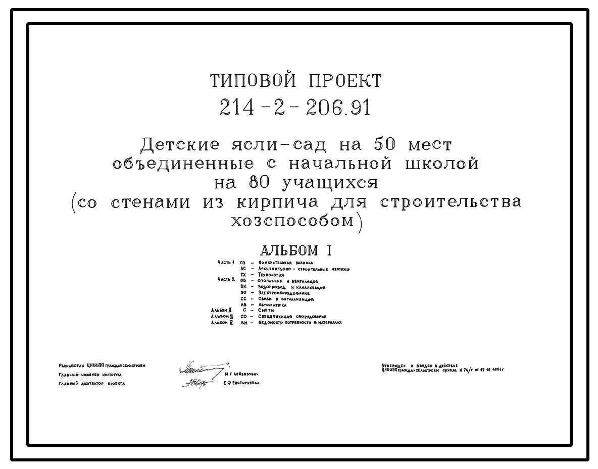 Типовой проект 214-2-206.91 Детские ясли – сад на 50 мест, объединенные с начальной школой на 80 учащихся ( со стенами из кирпича, для строительства хозспособом). Здание одноэтажное.
