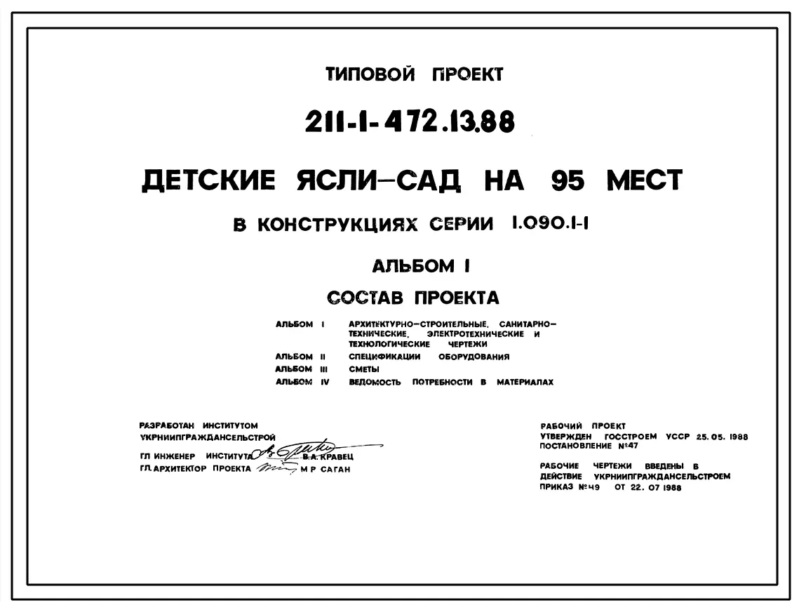 Типовой проект 211-1-472.13.88 ДЕТСКИЕ ЯСЛИ-САД НА 95 МЕСТ В КОНСТРУКЦИЯХ СЕРИИ 1.090.1-1