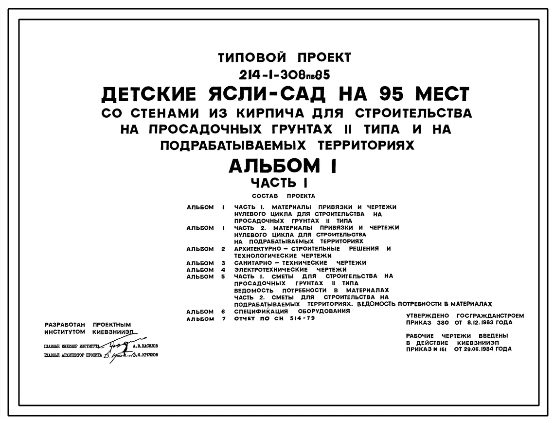 Типовой проект 214-1-308пв.85 ДЕТСКИЕ САД-ЯСЛИ НА 95 МЕСТ (СО СТЕНАМИ ИЗ КИРПИЧА)