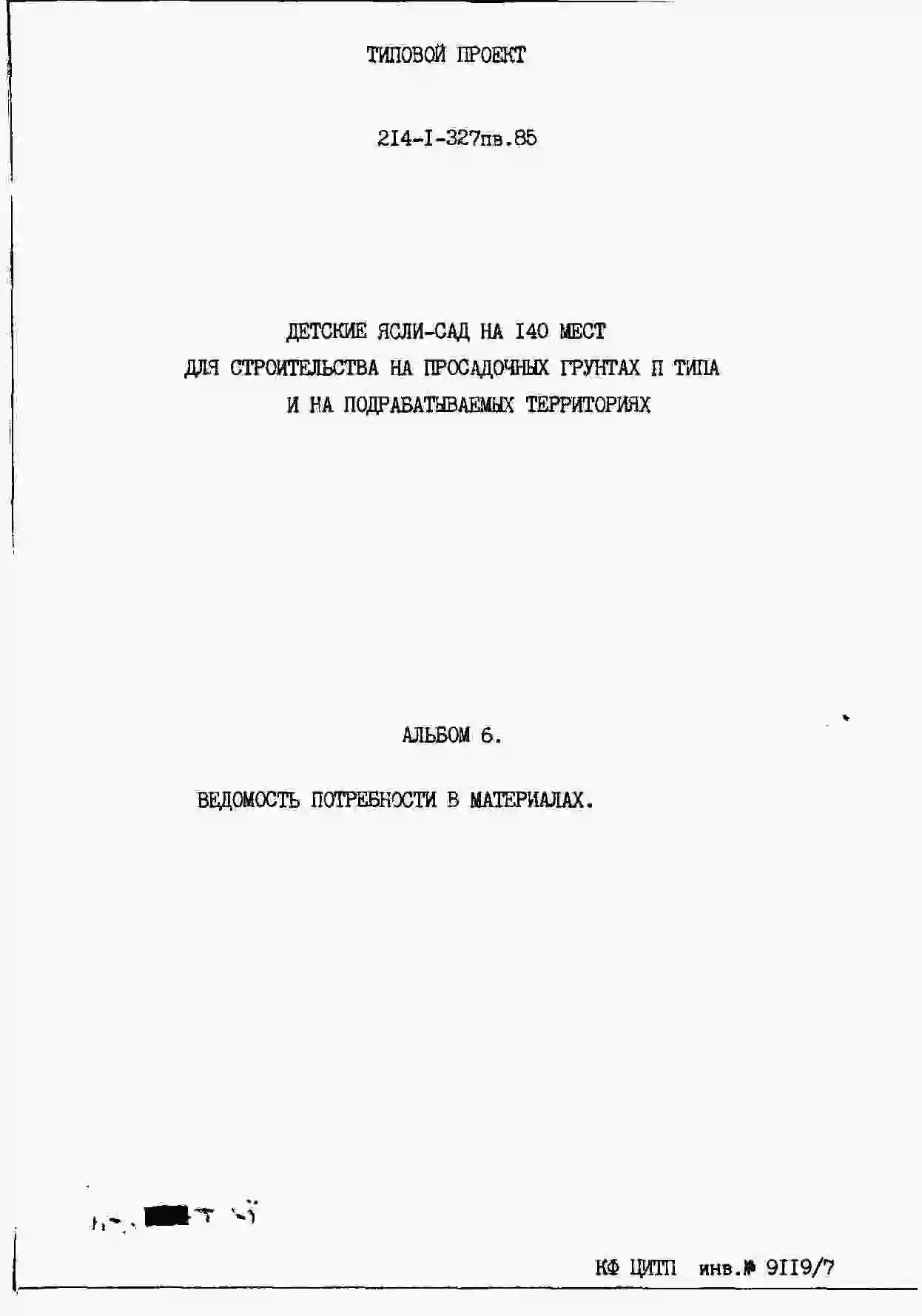 Типовой проект 214-1-327пв.85 ДЕТСКИЕ ЯСЛИ-САД НА 140 МЕСТ (СО СТЕНАМИ ИЗ КИРПИЧА).