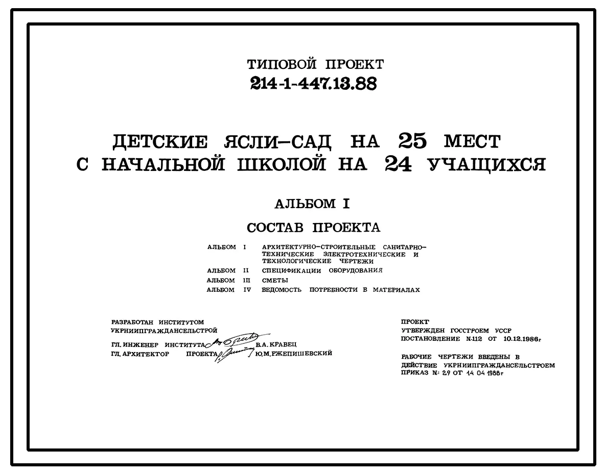 Типовой проект 214-1-447.13.88 Детские ясли-сад на 25 мест с начальной школой на 24 учащихся для строительства в УССР