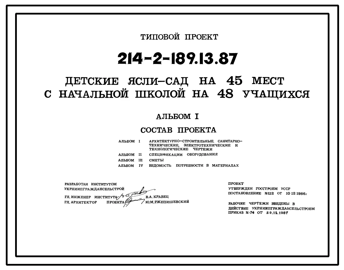 Типовой проект 214-2-189.13.87 Детские ясли-сад на 45 мест с начальной школой на 48 учащихся для строительства в УССР