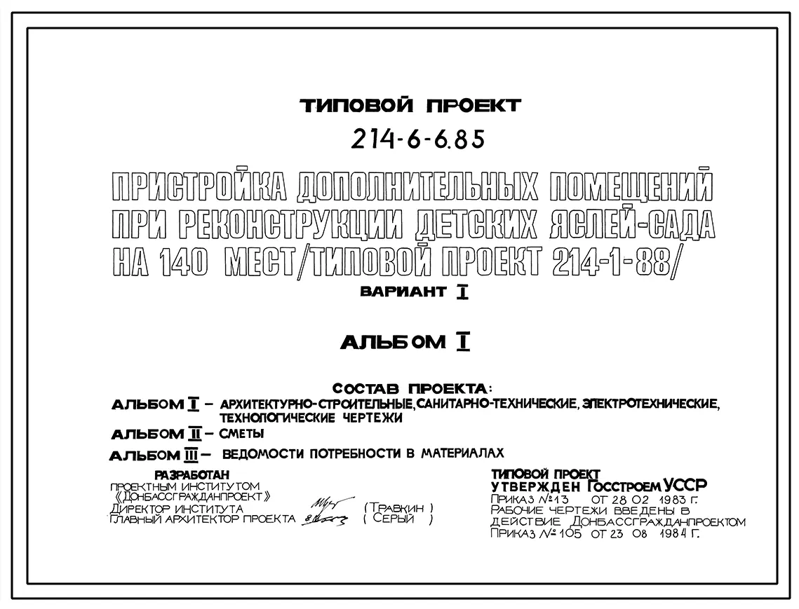 Типовой проект 214-6-6.85 Пристройка дополнительных помещений при реконструкции детских яслей-садов на 140 мест, построенных по т.п. 214-1-88 (вариант 1)