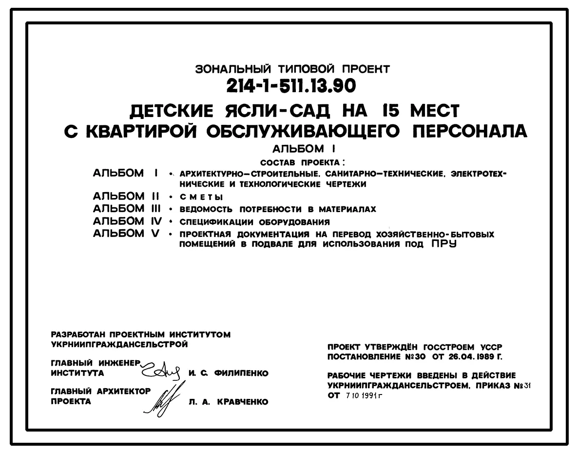 Типовой проект 214-1-511.13.90 Детские ясли-сад на 15 мест с квартирой обслуживающего персонала