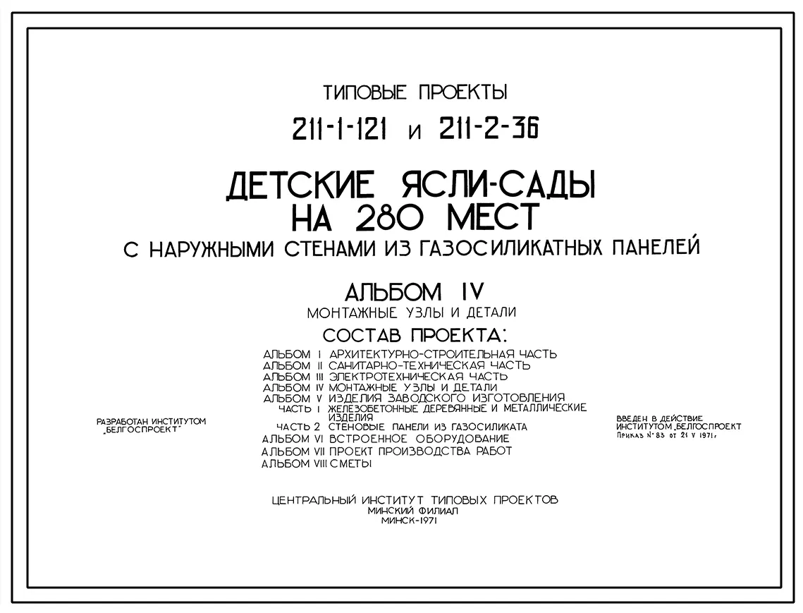 Типовой проект 211-2-36 Детские ясли-сад на 280 мест с круглосуточным пребыванием детей для строительства во 2 строительно-климатической зоне.