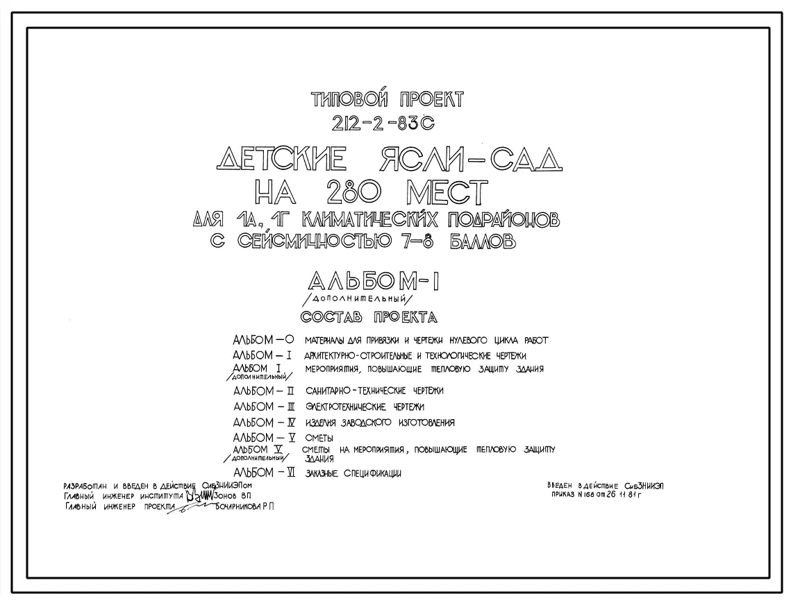 Типовой проект 212-2-83с Детские ясли-сад на 280 мест для IА и IГ климатических подрайонов с сейсмичностью 7-8 баллов в конструкциях ИИС-04.