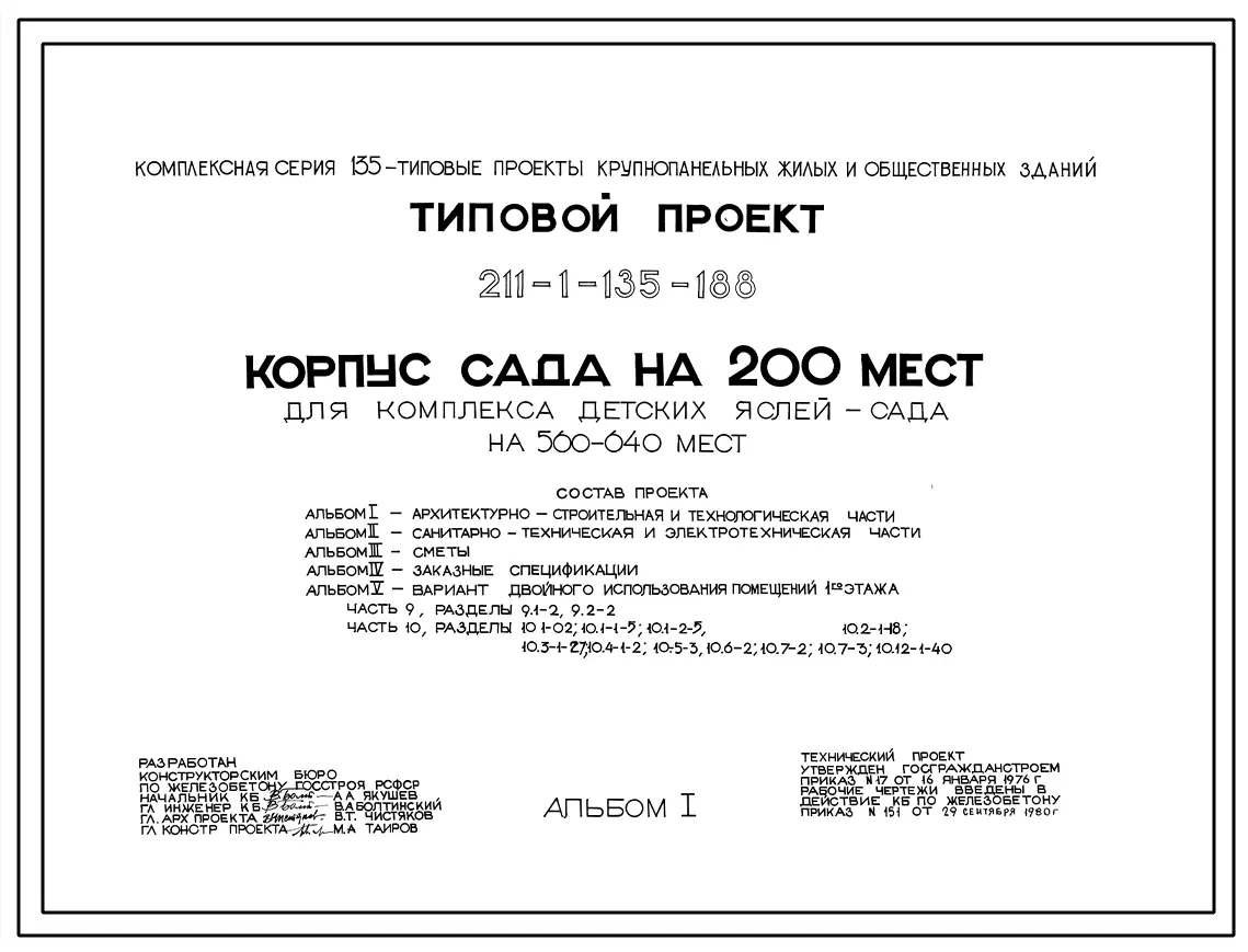 Типовой проект 211-1-135-188 Корпус детского сада на 200 мест для комплекса детских яслей-сада на 560-640 мест. Для строительства в 1В климатическом подрайоне, 2 и 3 климатических районах