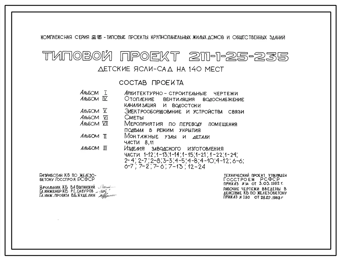 Типовой проект 211-1-25-235 Детские ясли-сад на 140 мест. Для строительства в 1В климатическом подрайоне, 2 и 3 климатических районах.