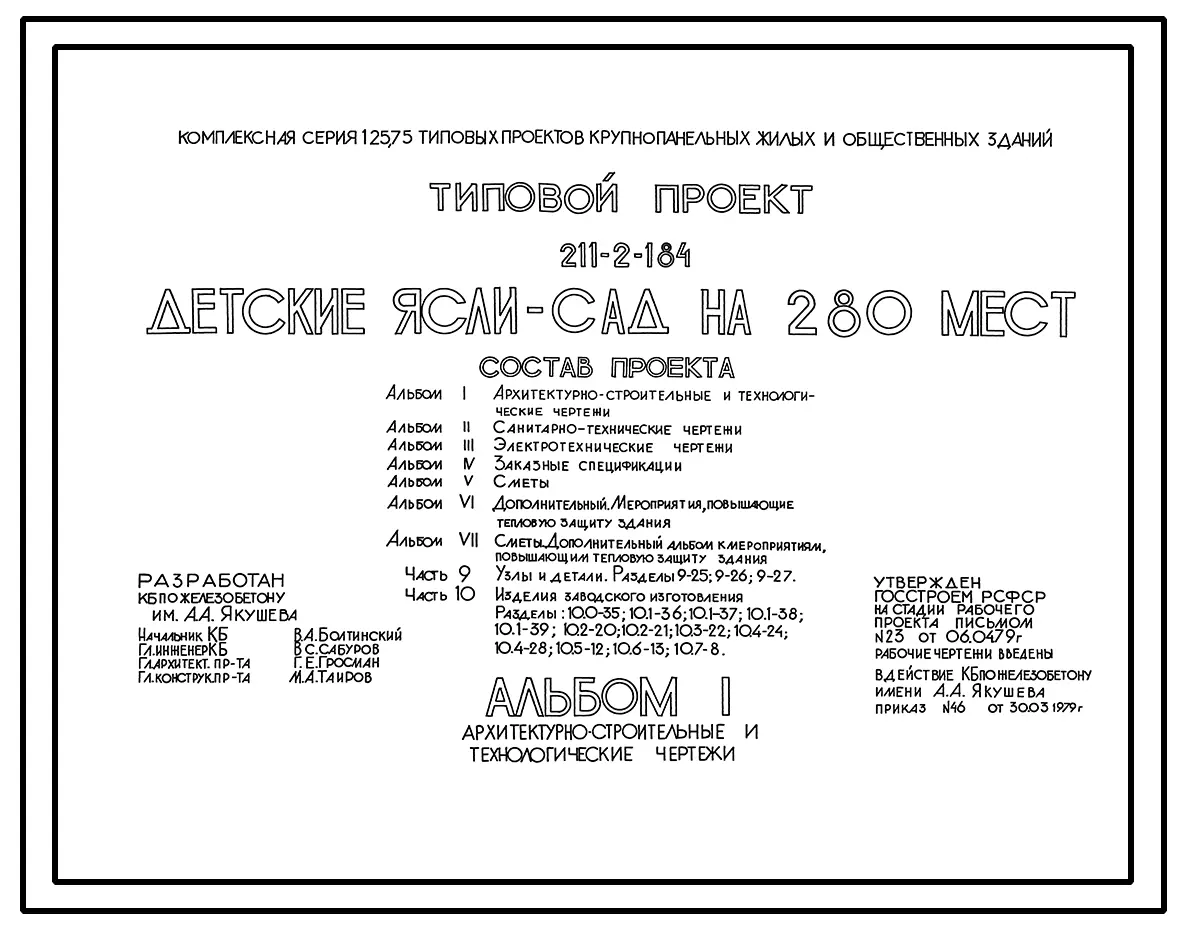 Типовой проект 211-2-184 Детские ясли-сад на 280 мест. Для строительства в 1В климатическом подрайоне, 2 и 3 климатических районах