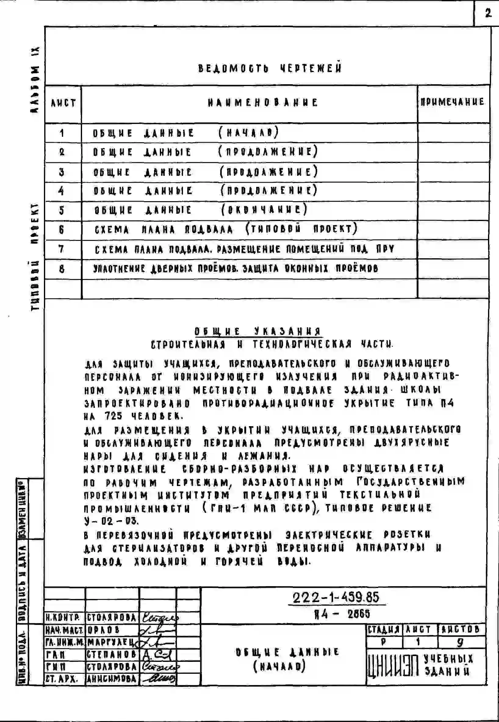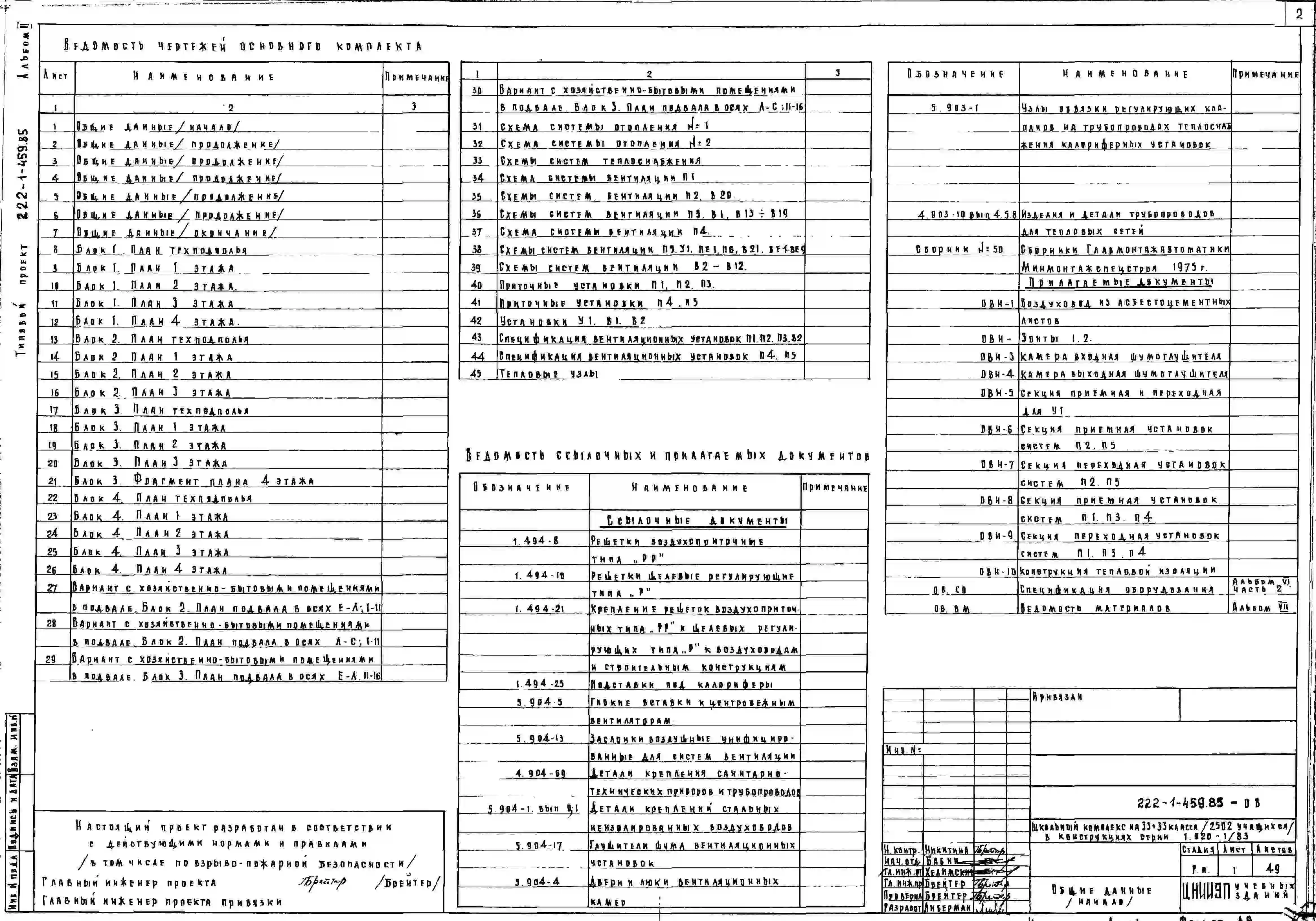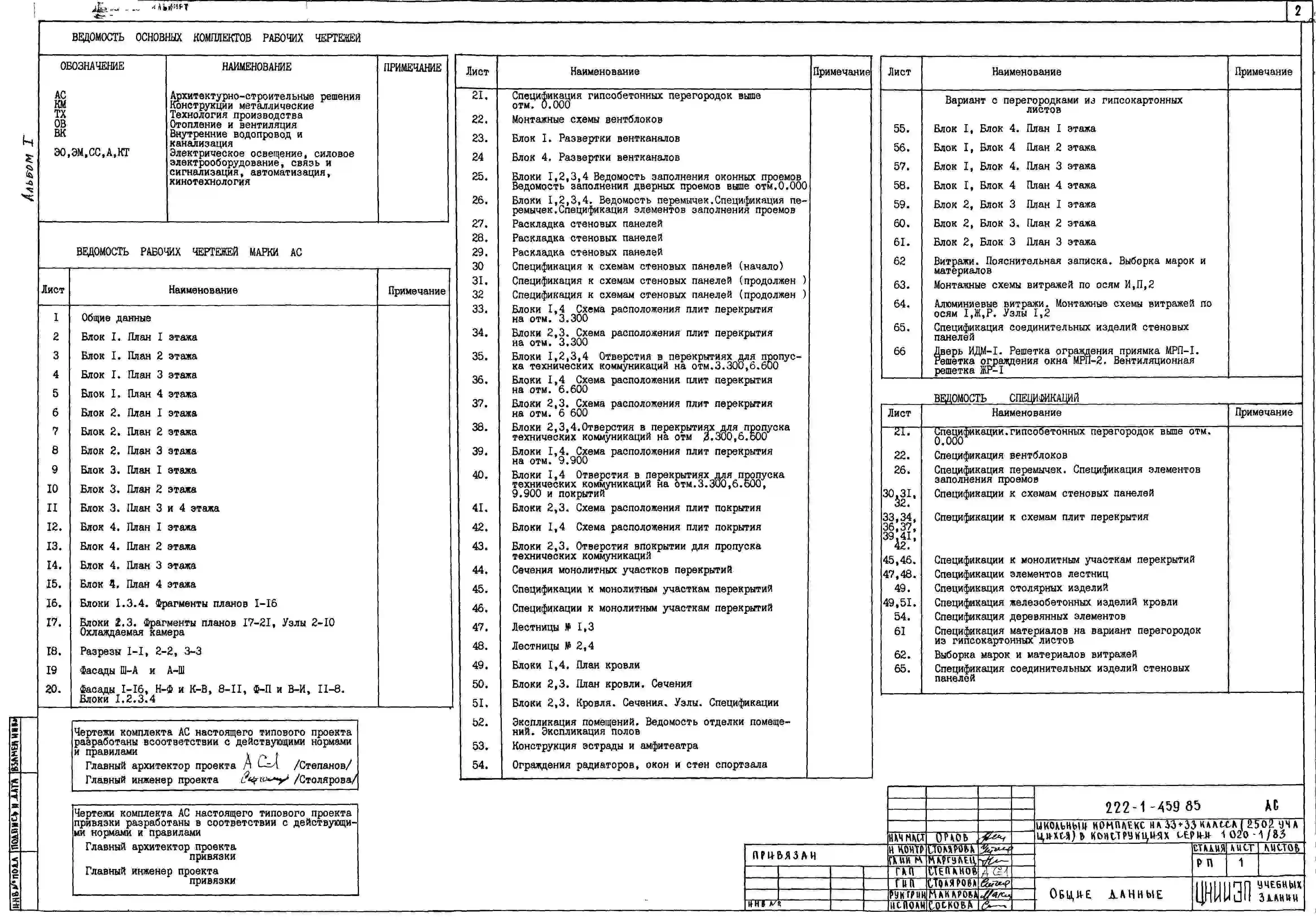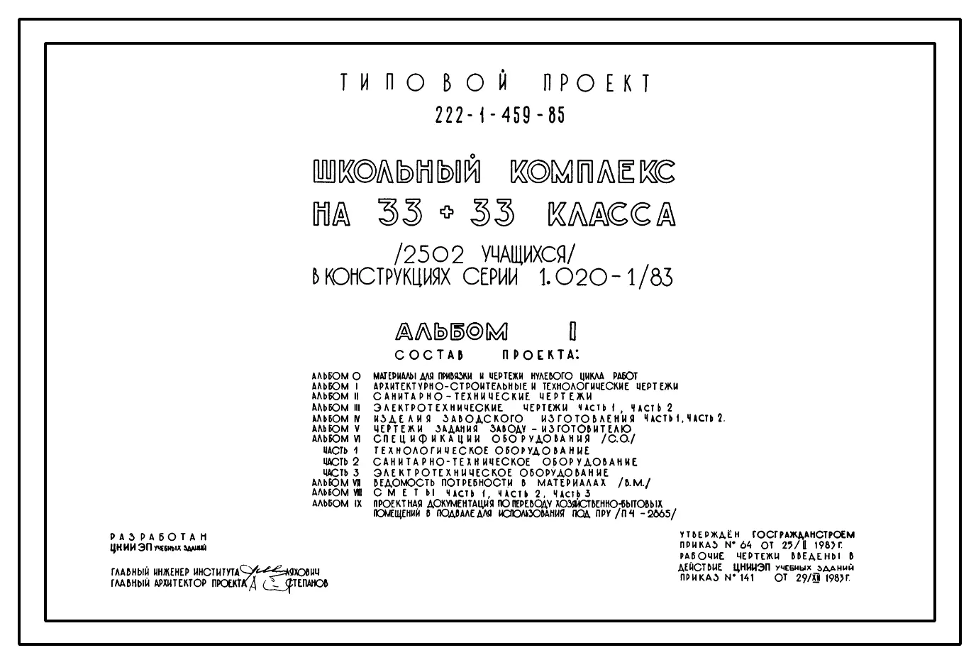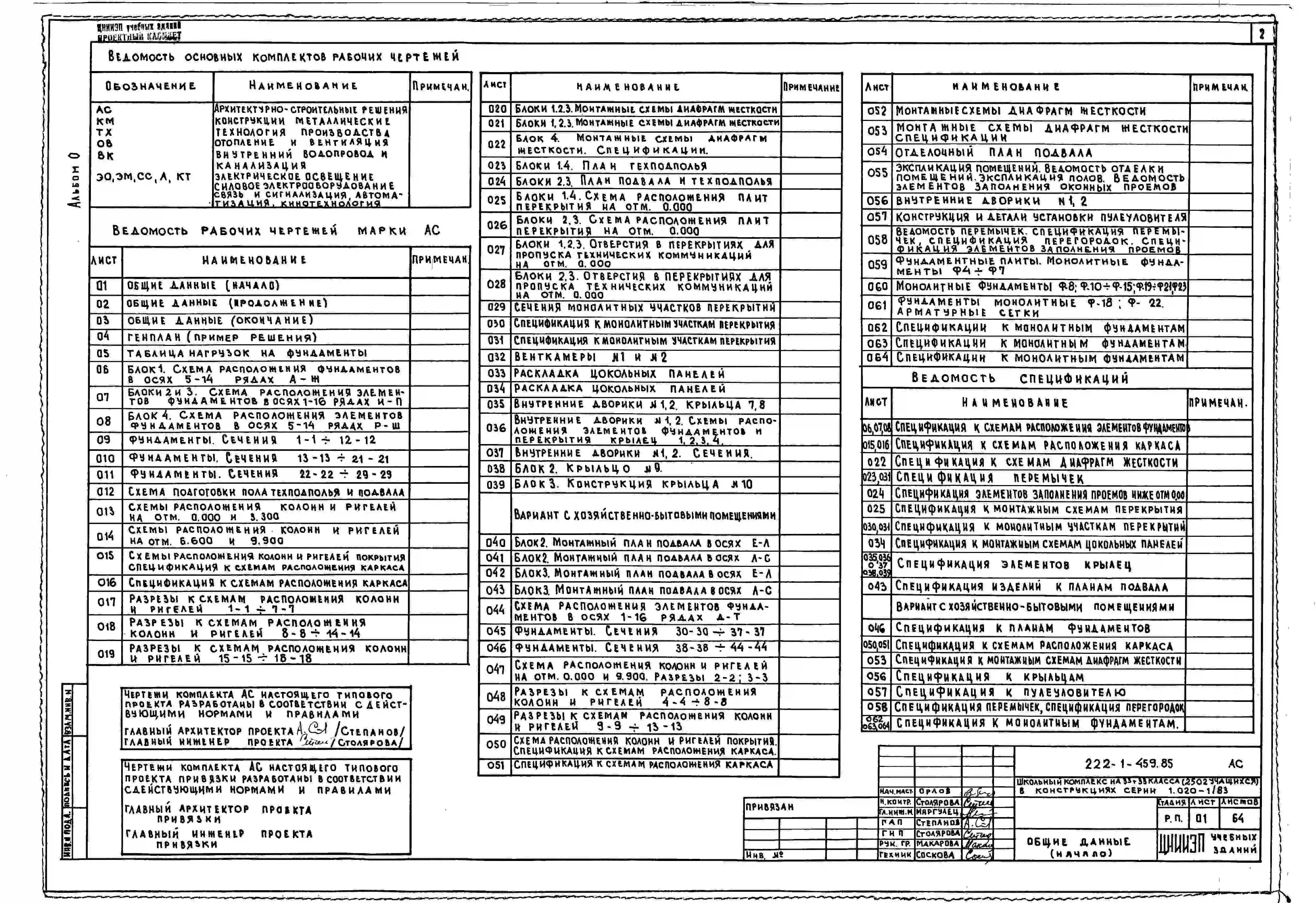 Типовой проект 222-1-459.85 Школьный комплекс на 33+33 класса (2502 учащихся). Здание четырехэтажное. Конструкции по серии 1.020.-1/83. Стены из керамзитобетонных панелей.