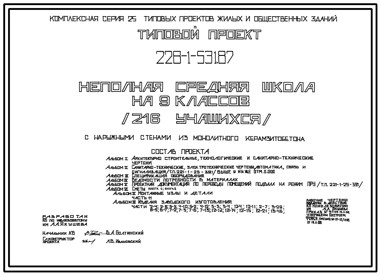 Типовой проект 228-1-531.87 Неполная средняя школа на 9 классов (216 учащихся). Здание одно-, двухэтажное. Стены из монолитного керамзитобетона.