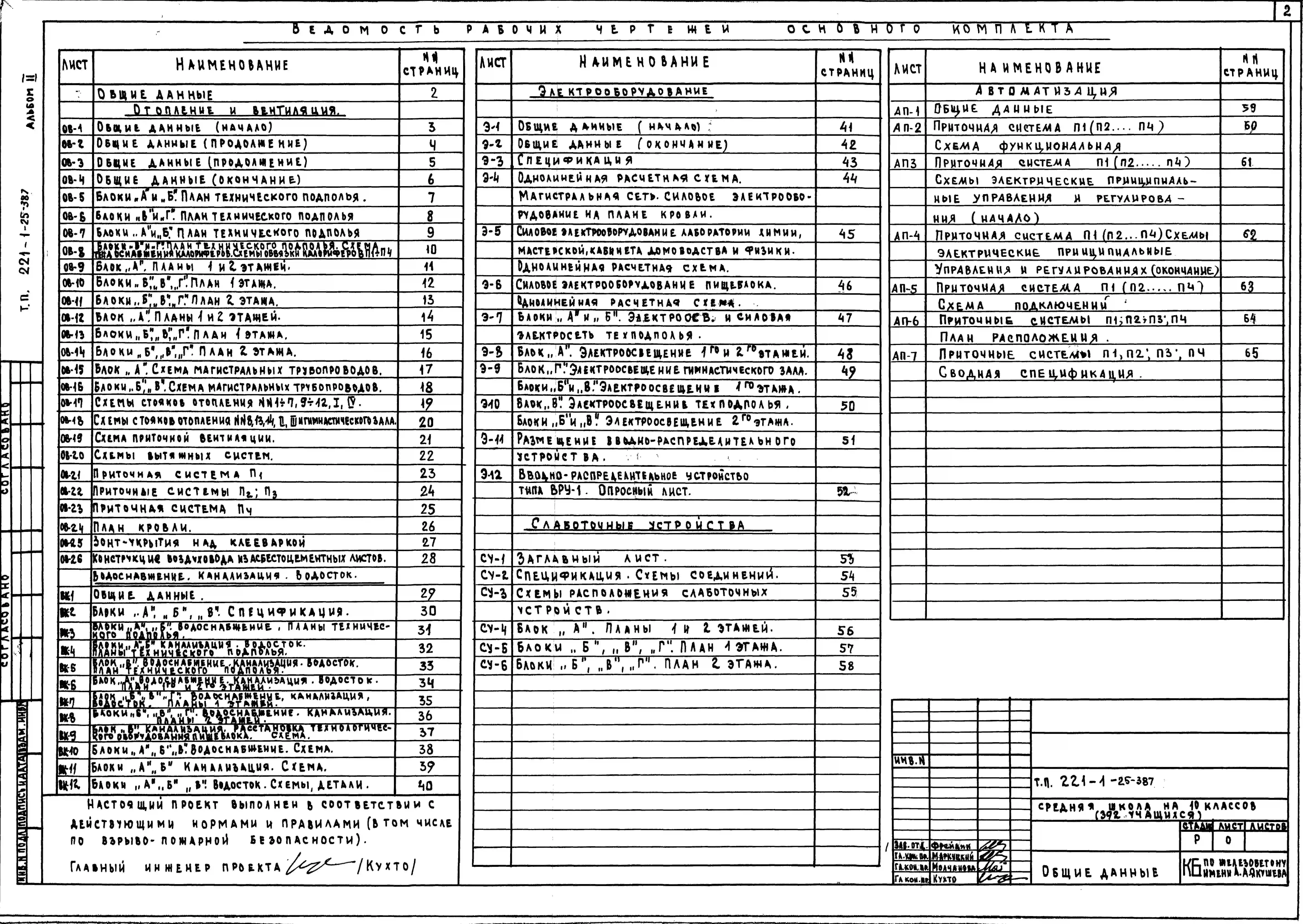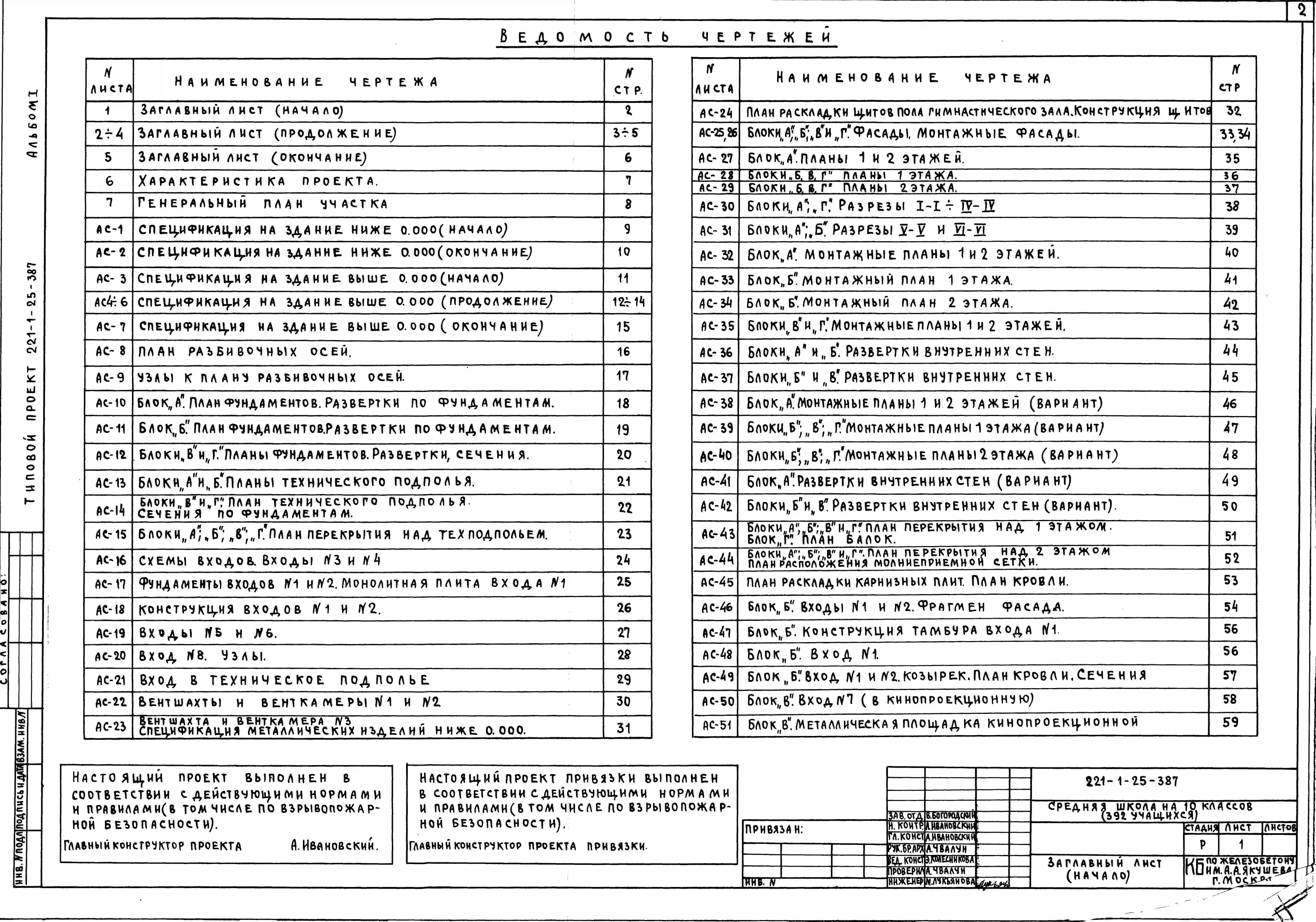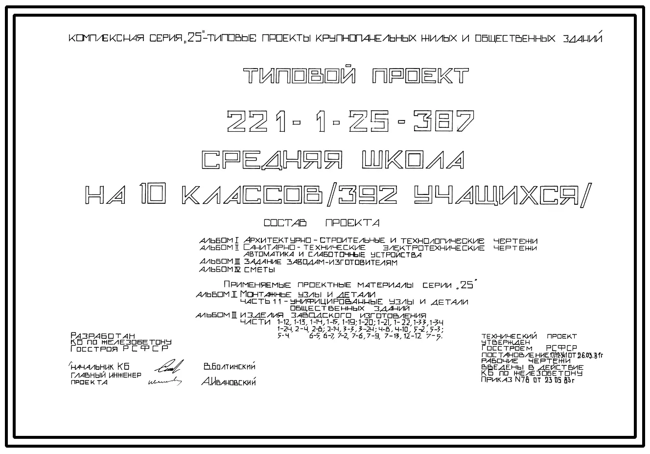 Типовой проект 221-1-25-387 Средняя школа на 10 классов (392 учащихся). Здание двухэтажное в конструкциях серии 25. Стены из однослойных легкобетонных панелей.