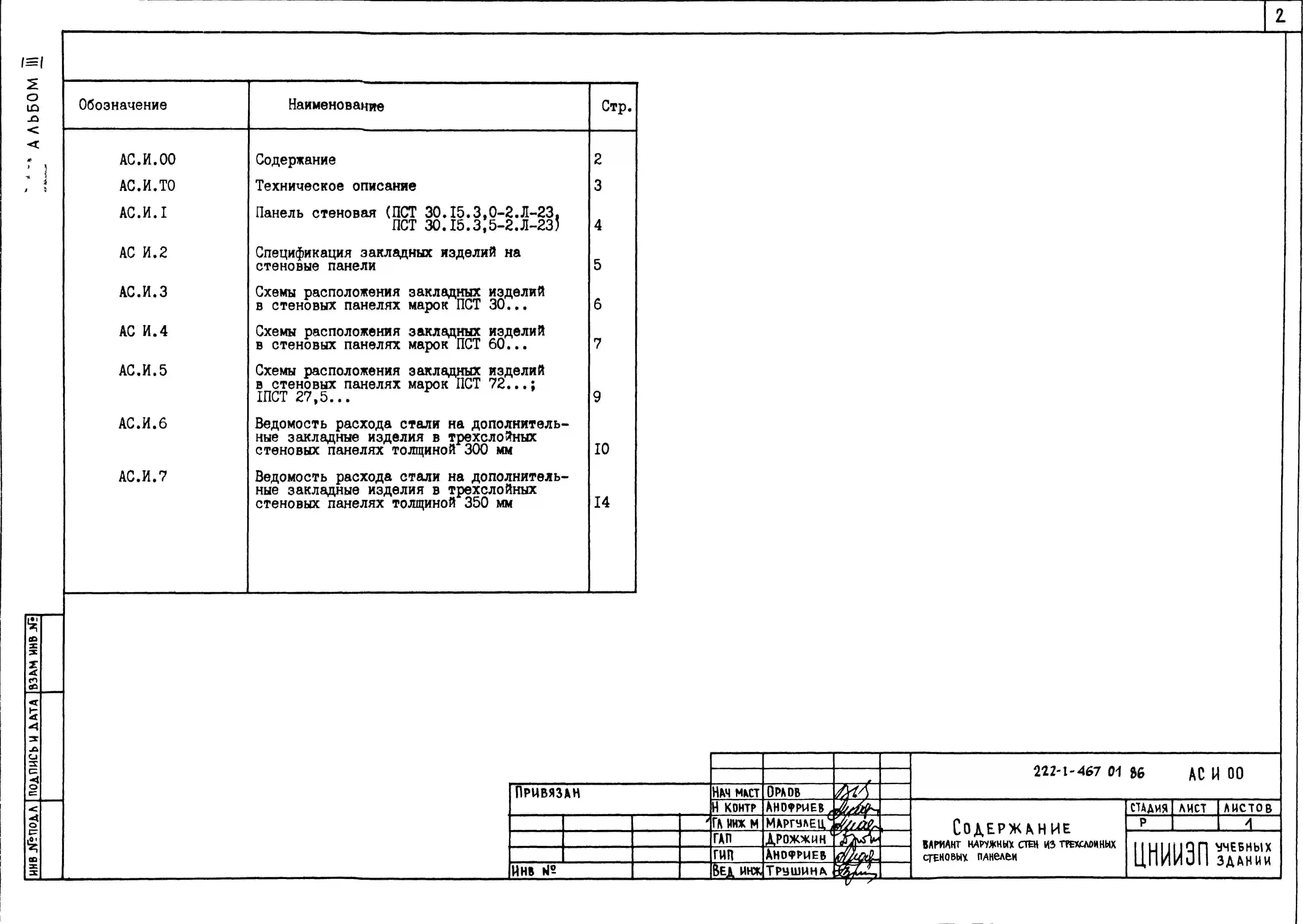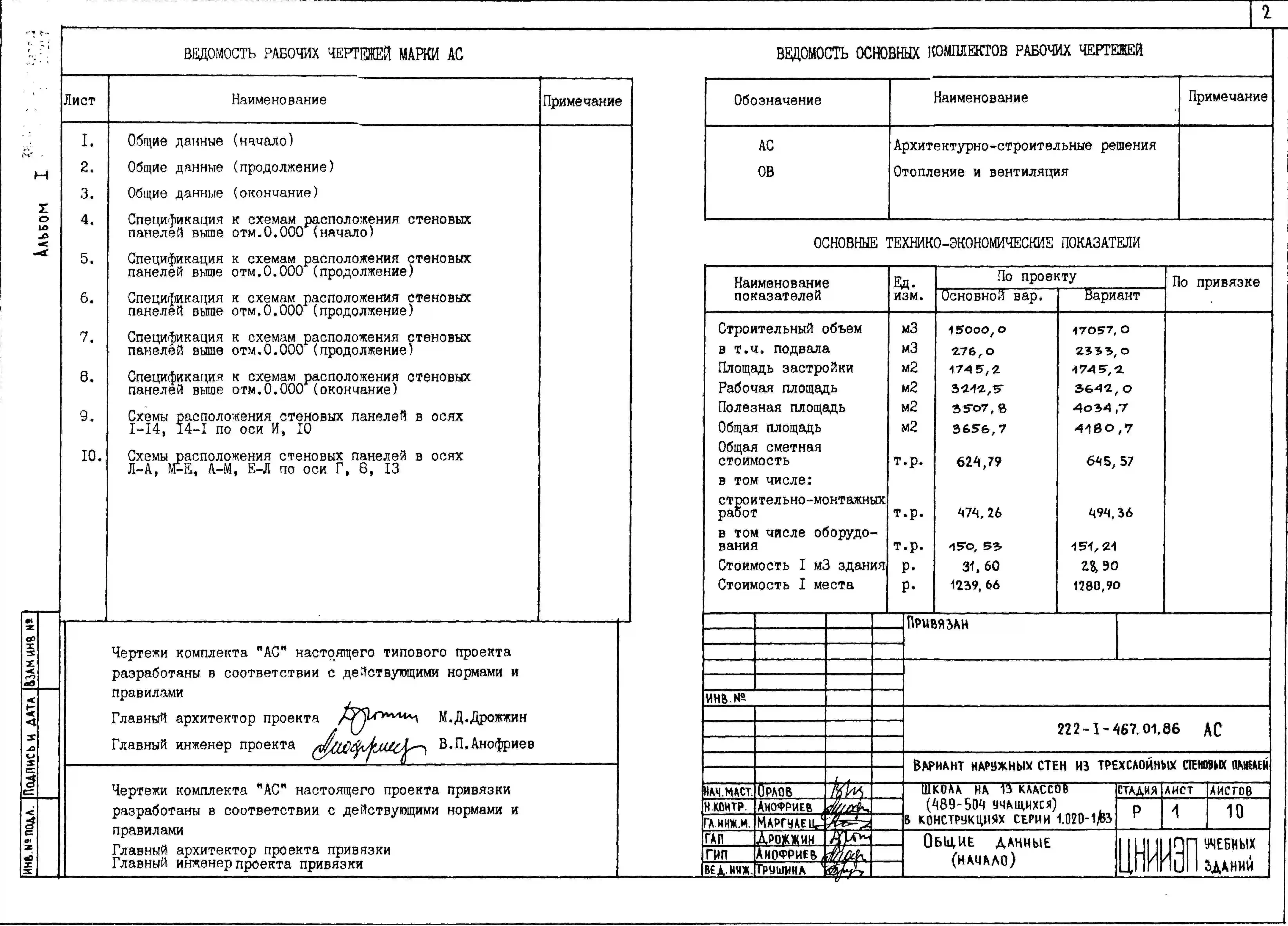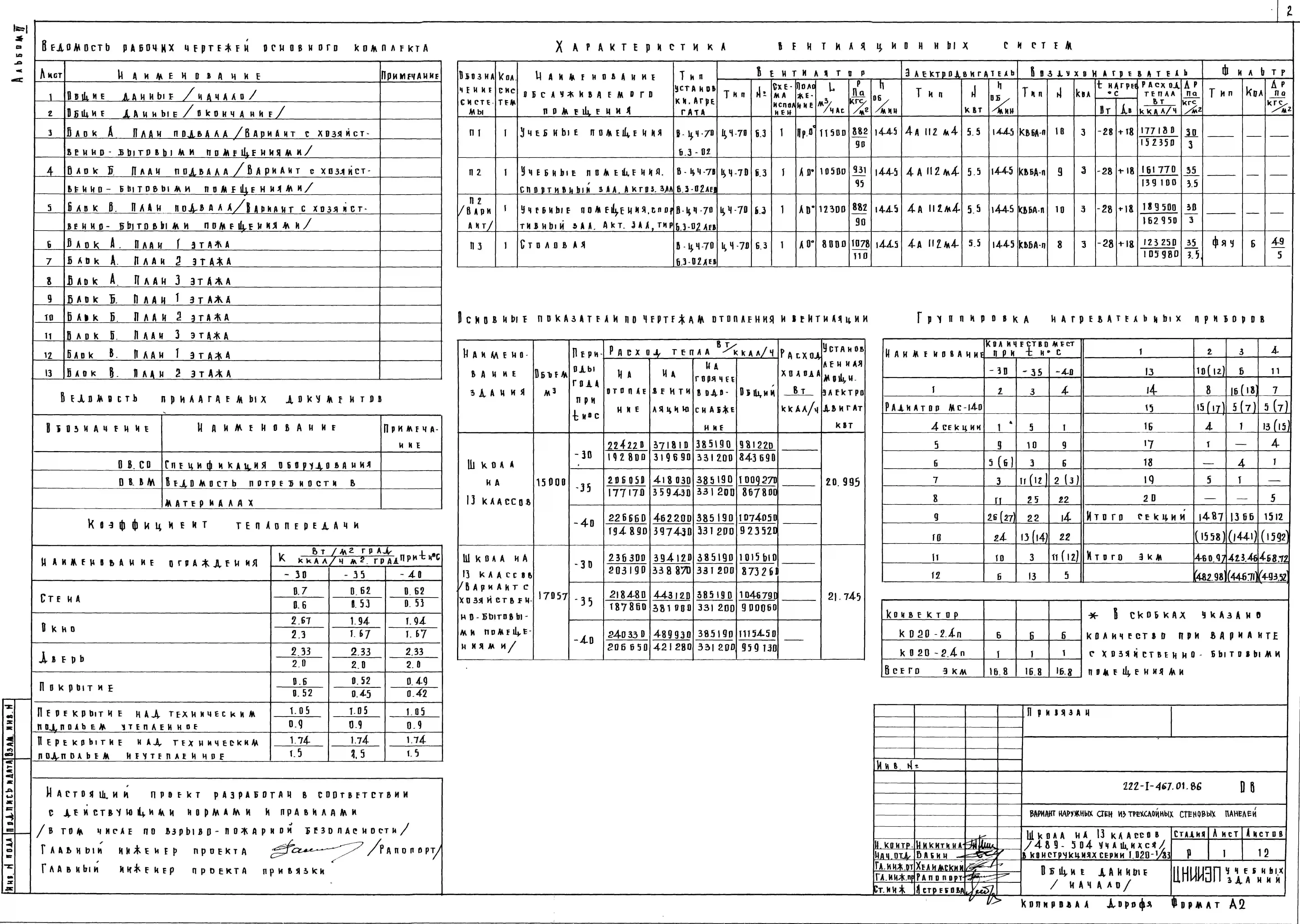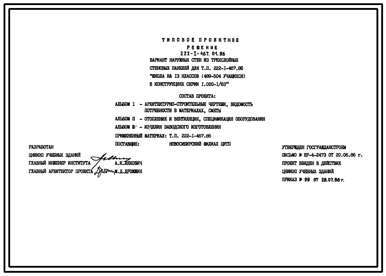Типовой проект 222-1-467.01.86 Вариант наружных стен из трехслойных стеновых панелей для типового проекта 222-1-467.86 «Школа на 13 классов (489-504 учащихся) в конструкциях серии 1.020-1/83»