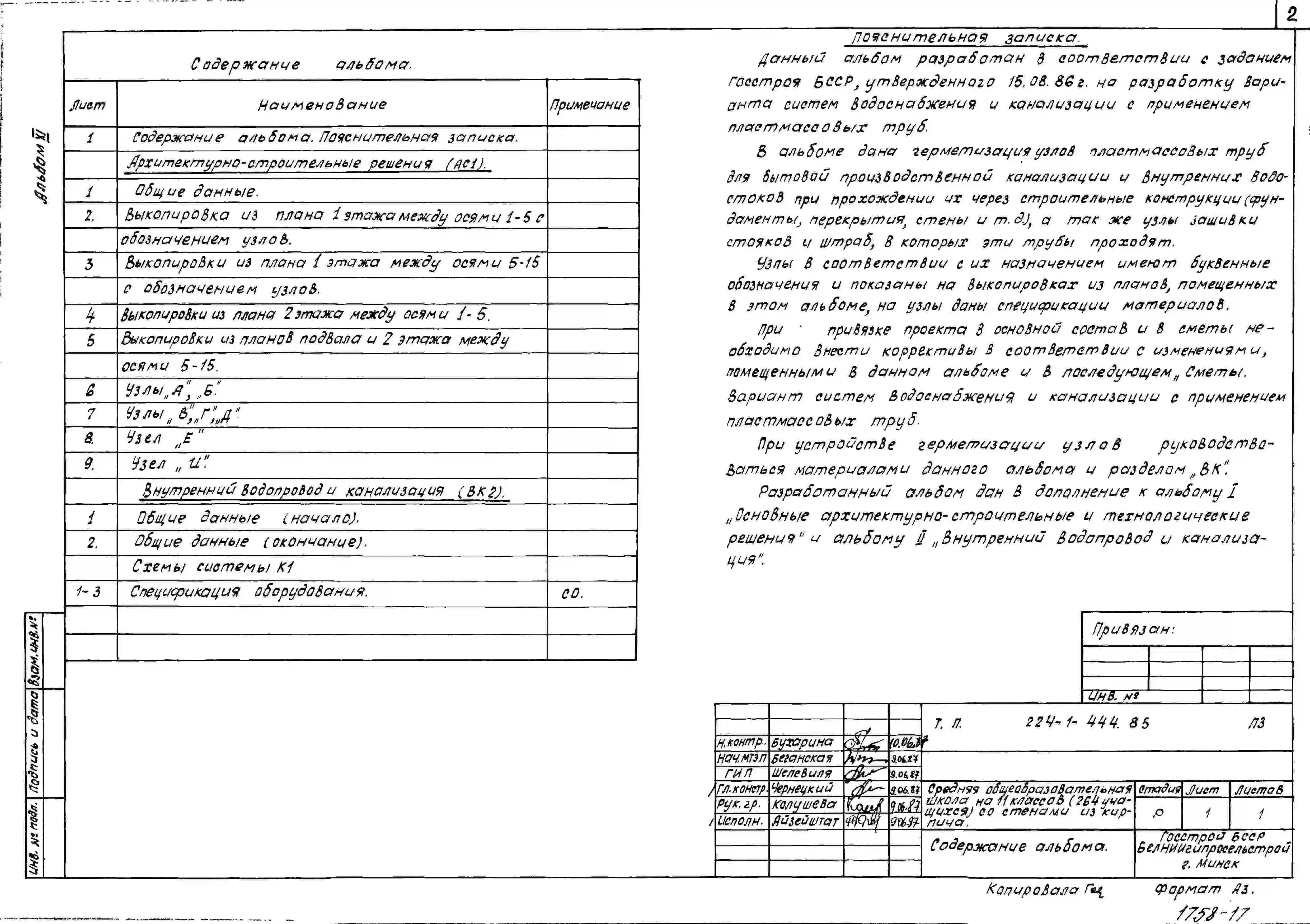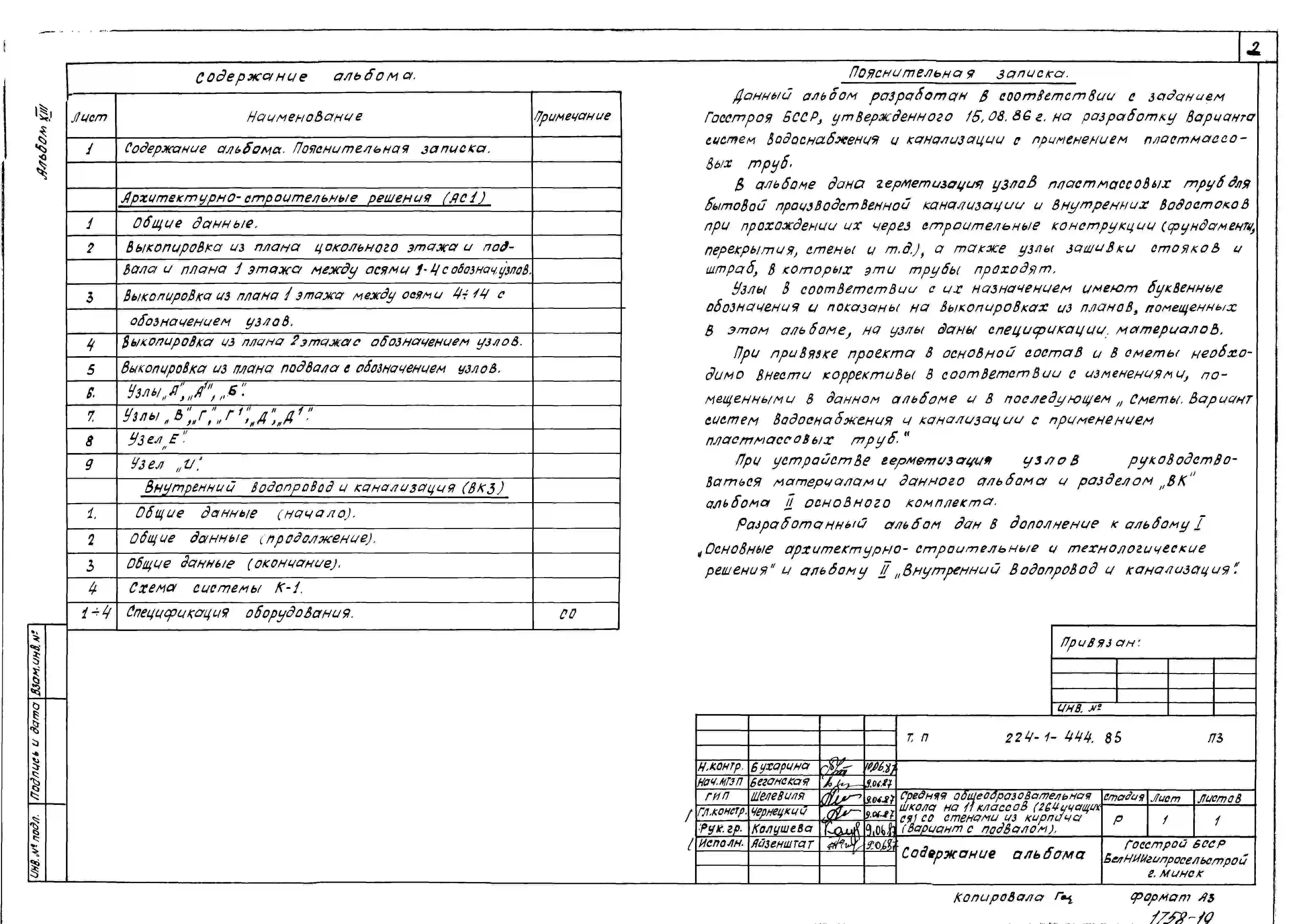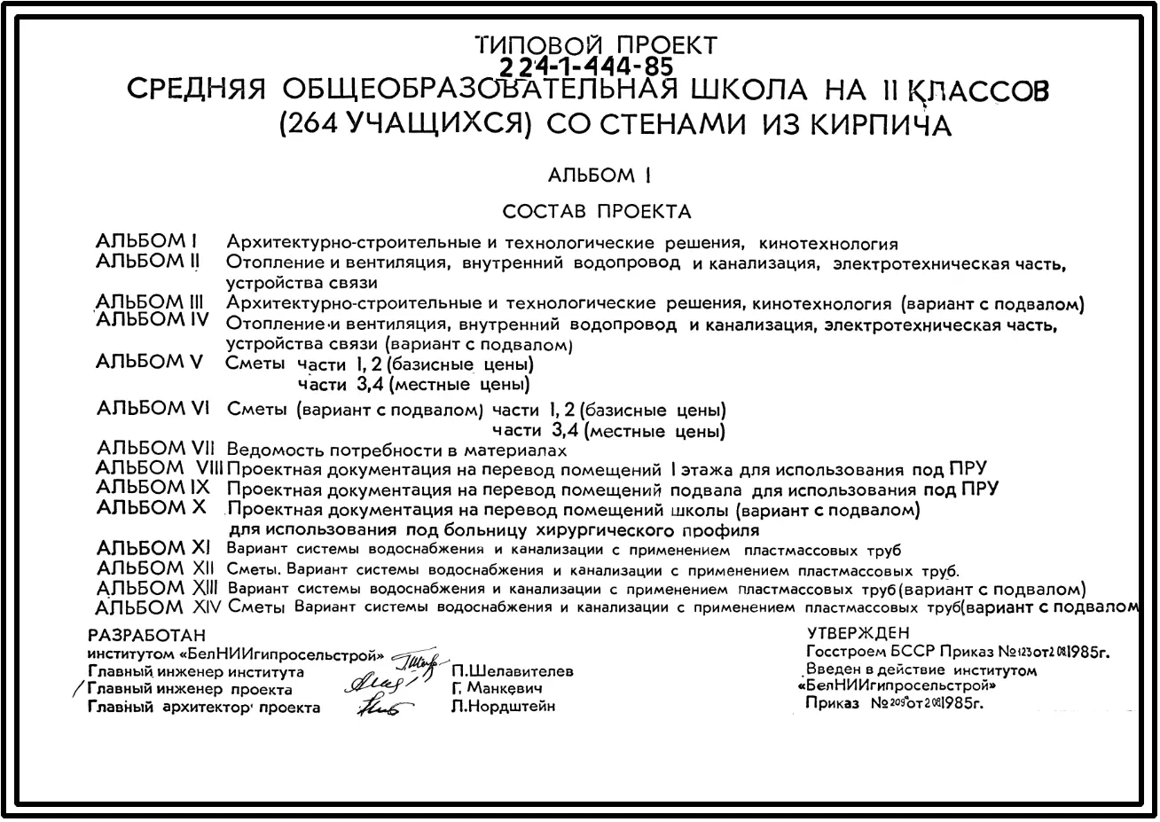 Типовой проект 224-1-444.85 Средняя общеобразовательная школа на 11 классов (264 учащихся). Со стенами из кирпича. Для сельского строительства