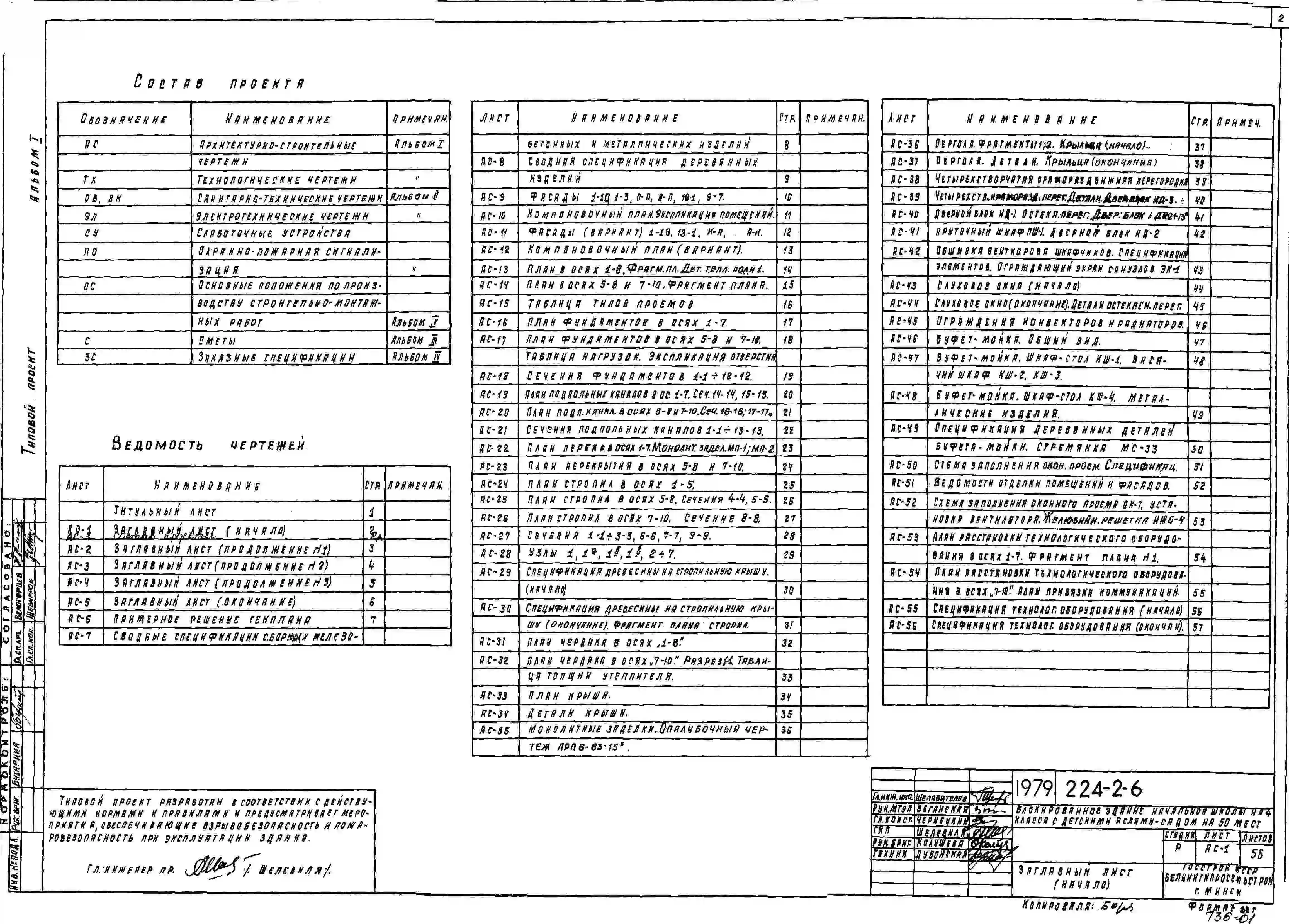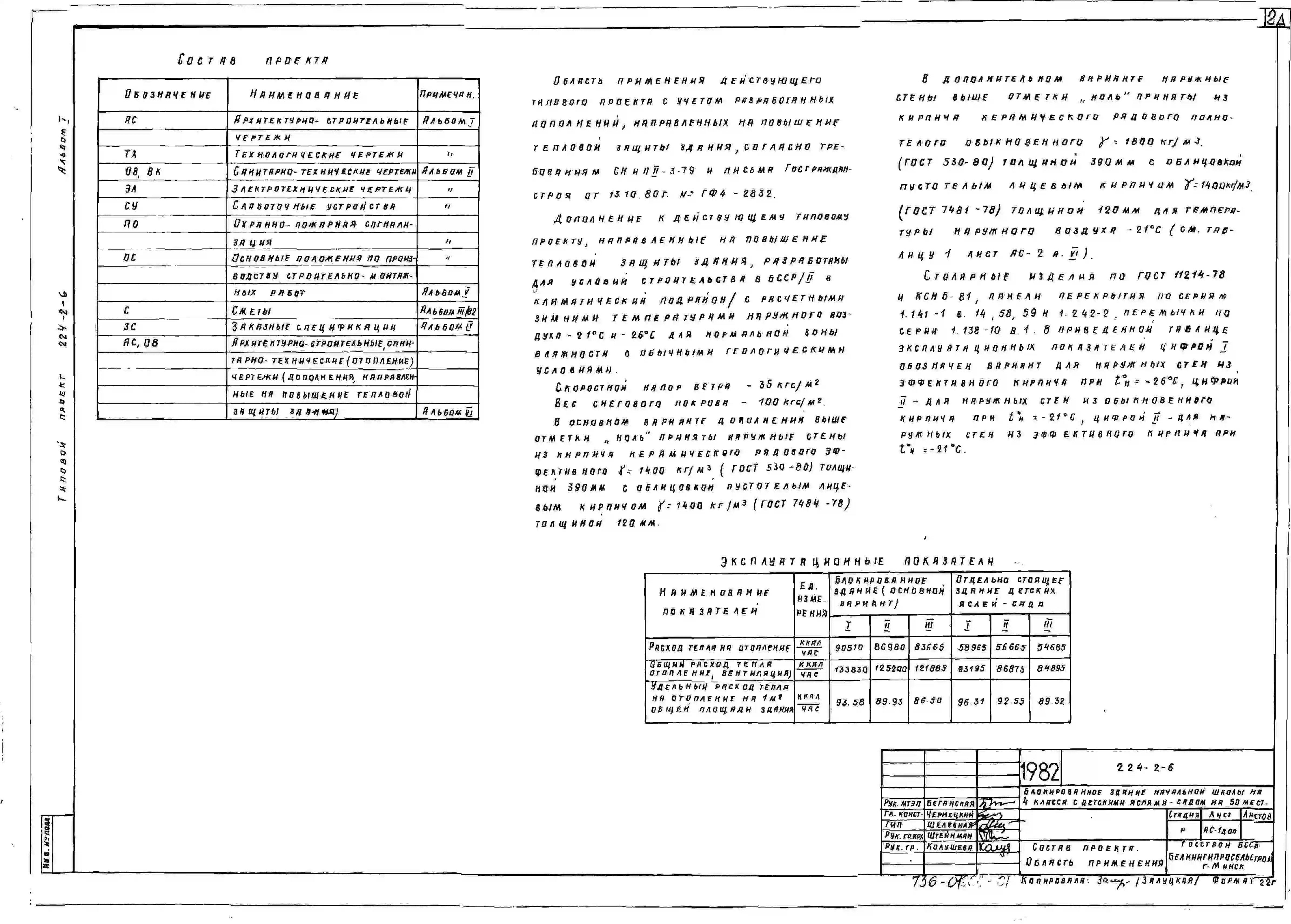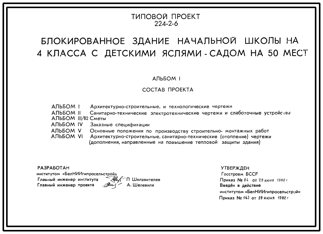 Типовой проект 224-2-6 Блокированное здание начальной школы на 4 класса с детскими яслями-садом на 50 мест. Для строительства во IIВ климатическом подрайоне Белорусской ССР.