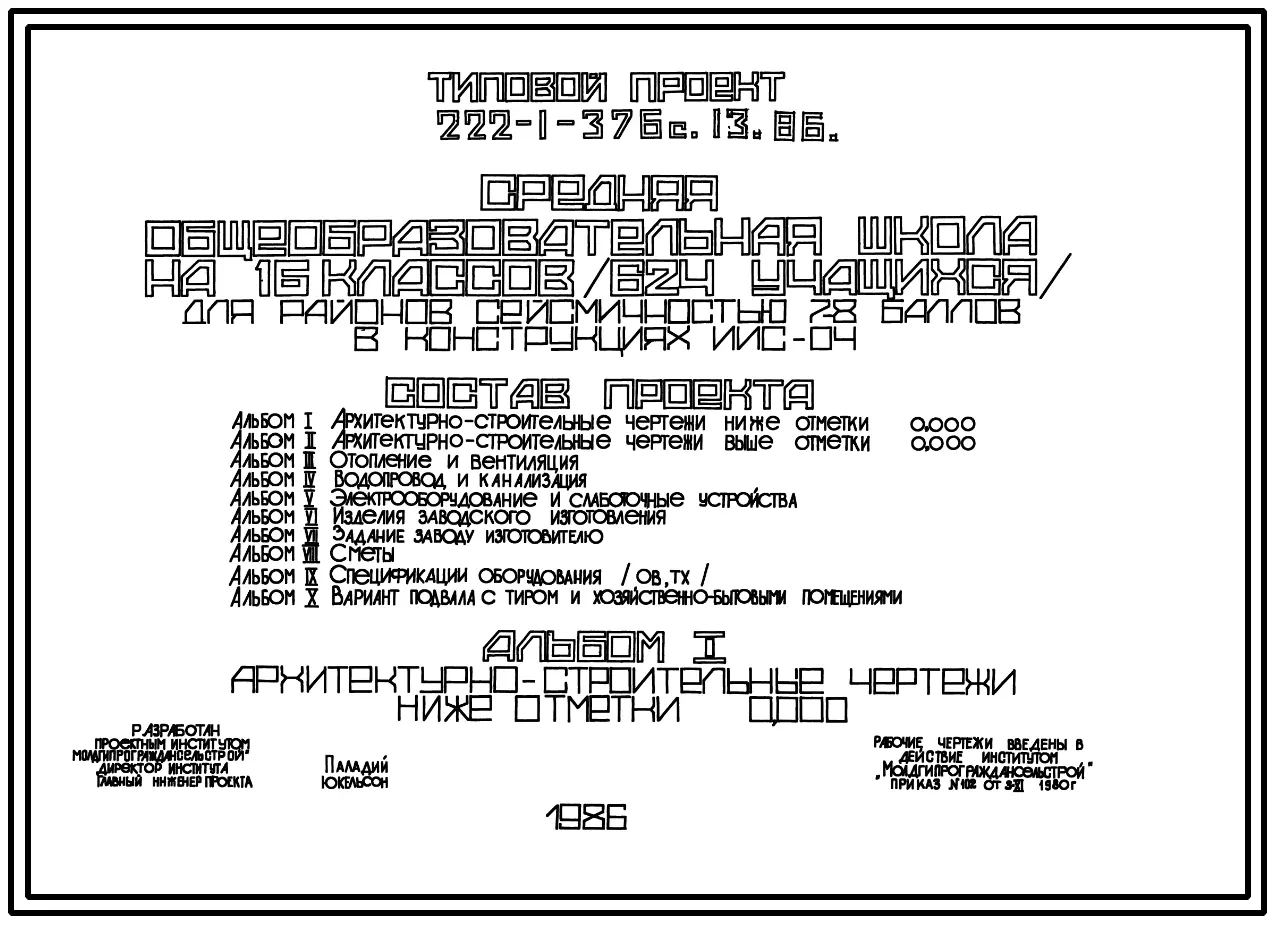 Типовой проект 222-1-376с.13.86 Средняя общеобразовательная школа на 16 классов (624 учащихся).