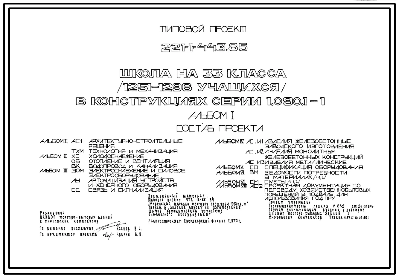 Типовой проект 221-1-443.85 Школа на 33 класса (1251-1296 учащихся). Для сельского строительства в 1В климатическом подрайоне, 2 и 3 климатических районах