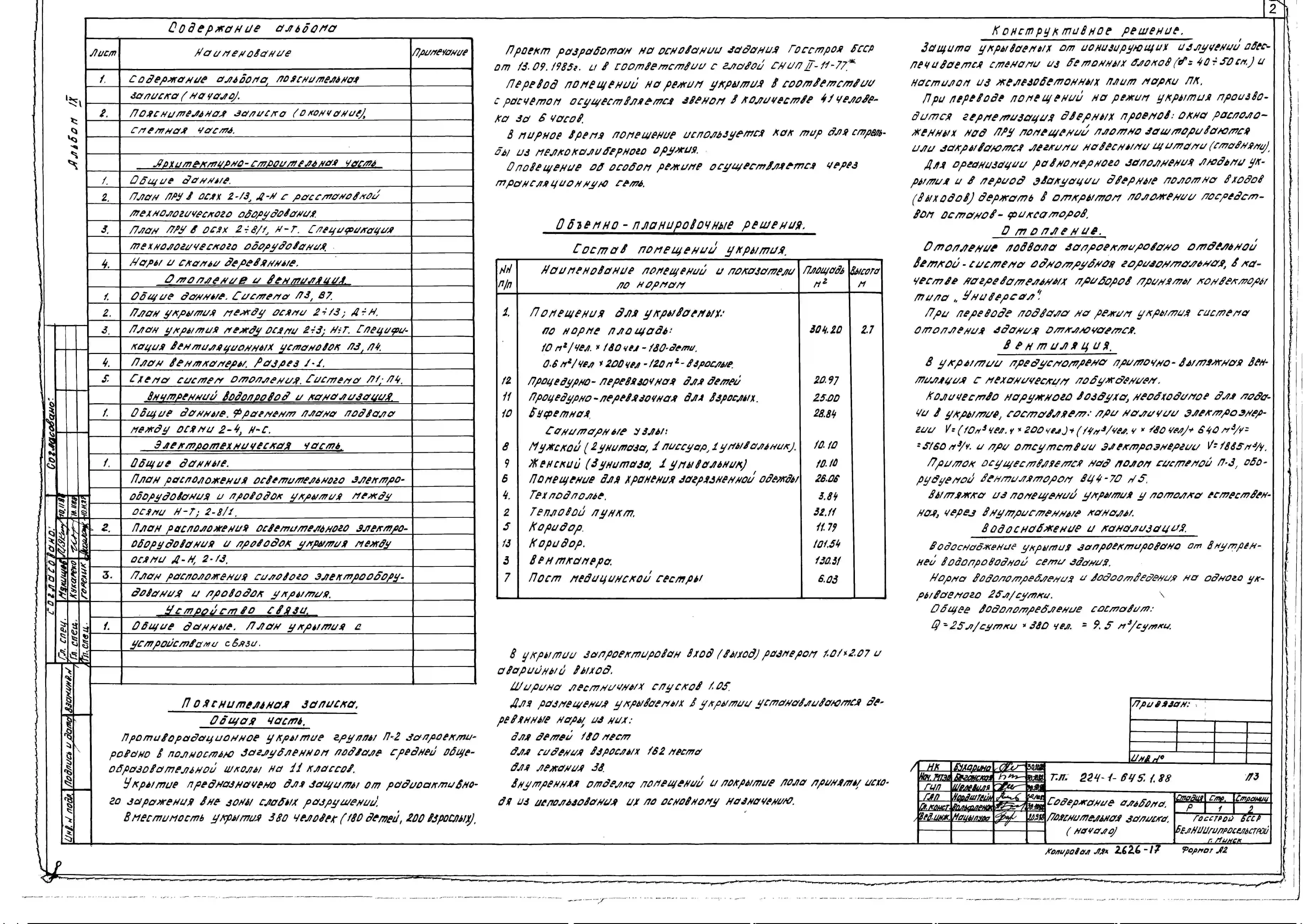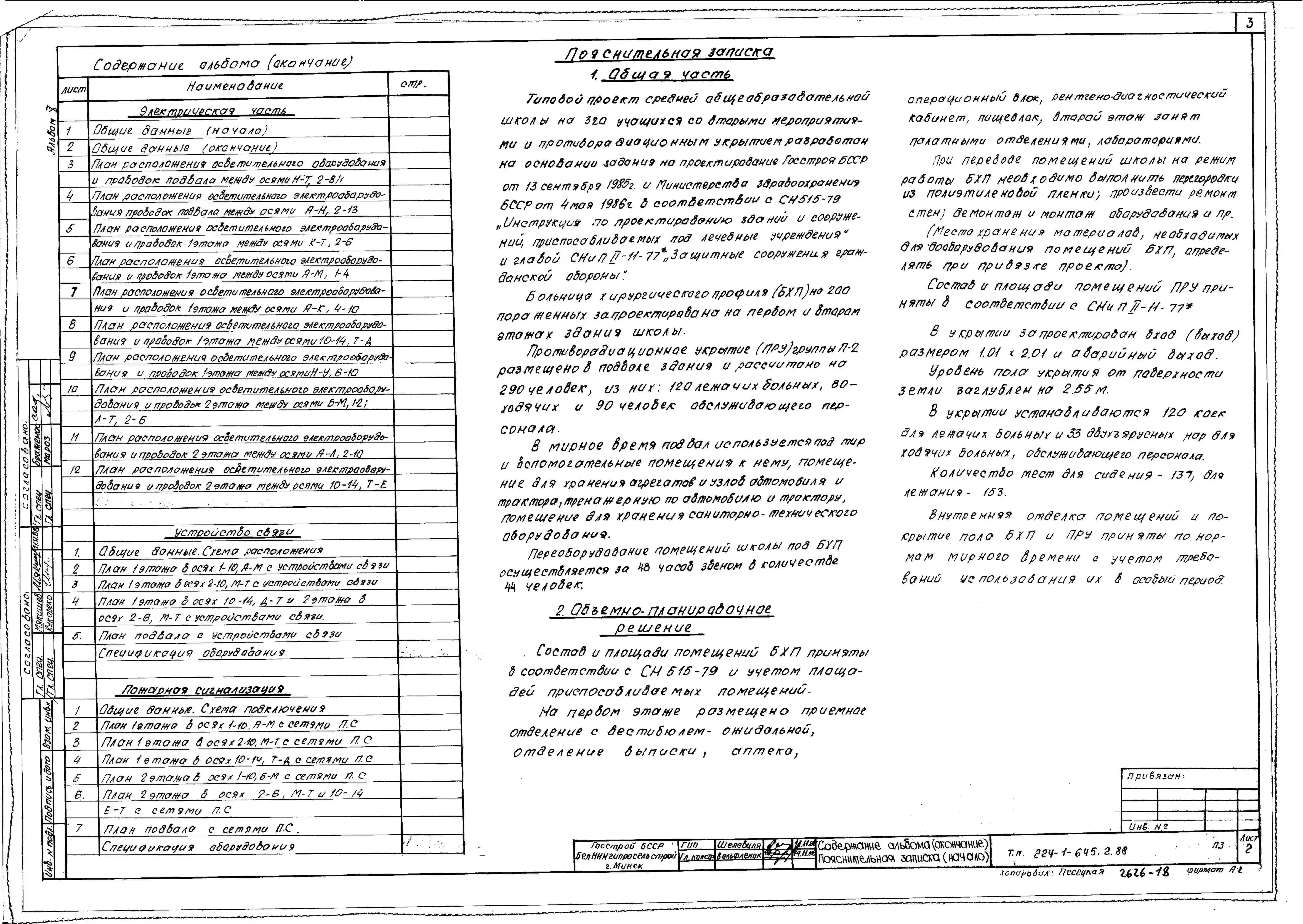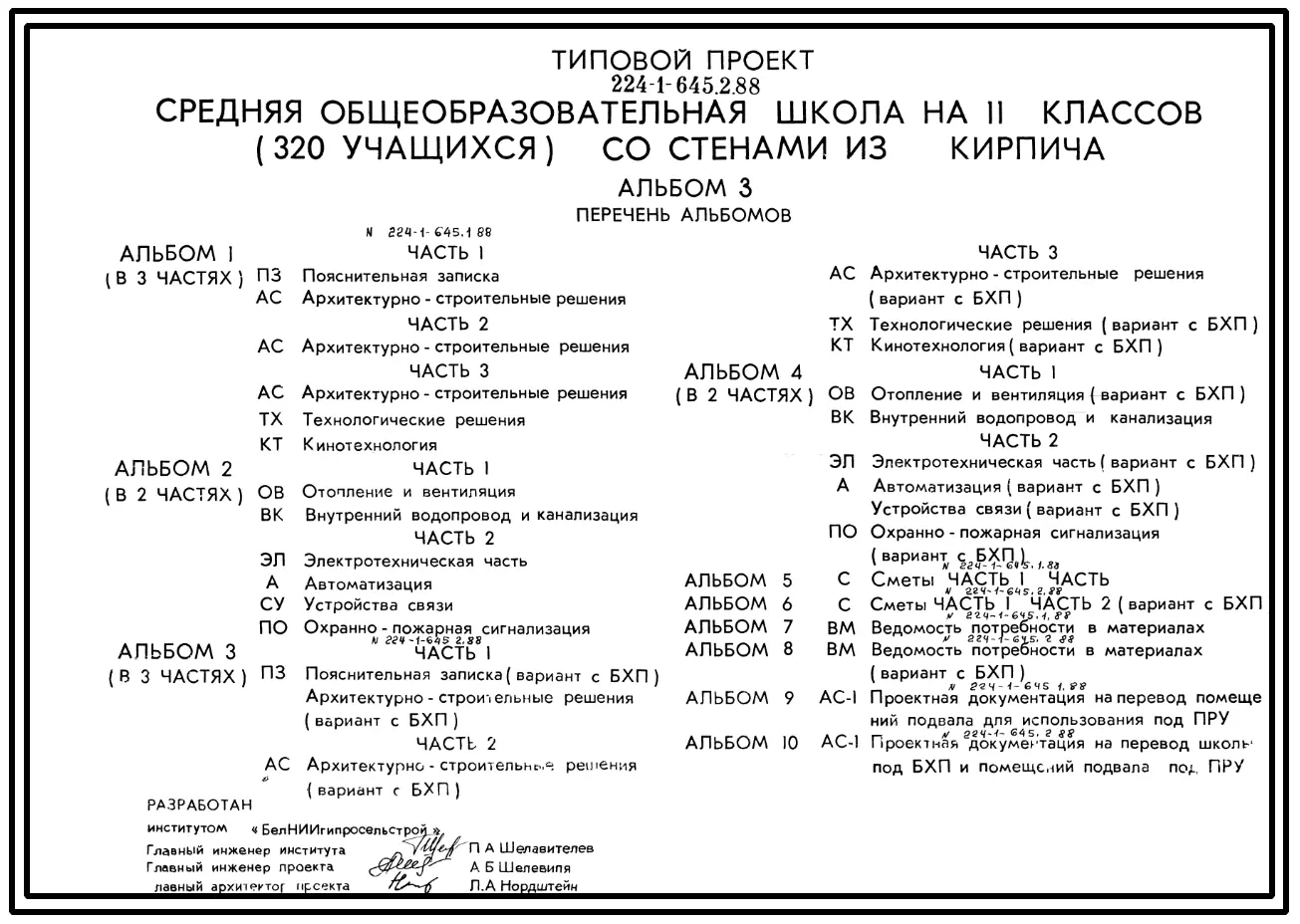 Типовой проект 224-1-645.2.88 Средняя общеобразовательная школа на 11 классов (320 учащихся) со стенами из кирпича. Конструктивный вариант школы приспосабливаемой под лечебное учреждение (БХП)