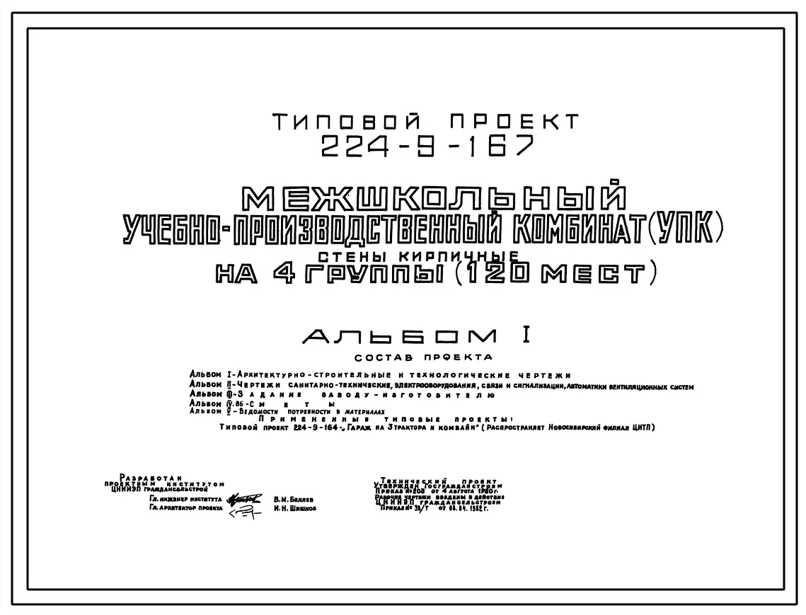 Типовой проект 224-9-167 Межшкольный учебно-производственный комбинат (УПК) на 4 группы (120 мест). Здание одно-, двухэтажное. Стены из кирпича.