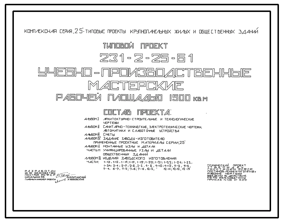 Типовой проект 231-2-25-61 Учебно-производственные мастерские рабочей площадью 1500 м.кв