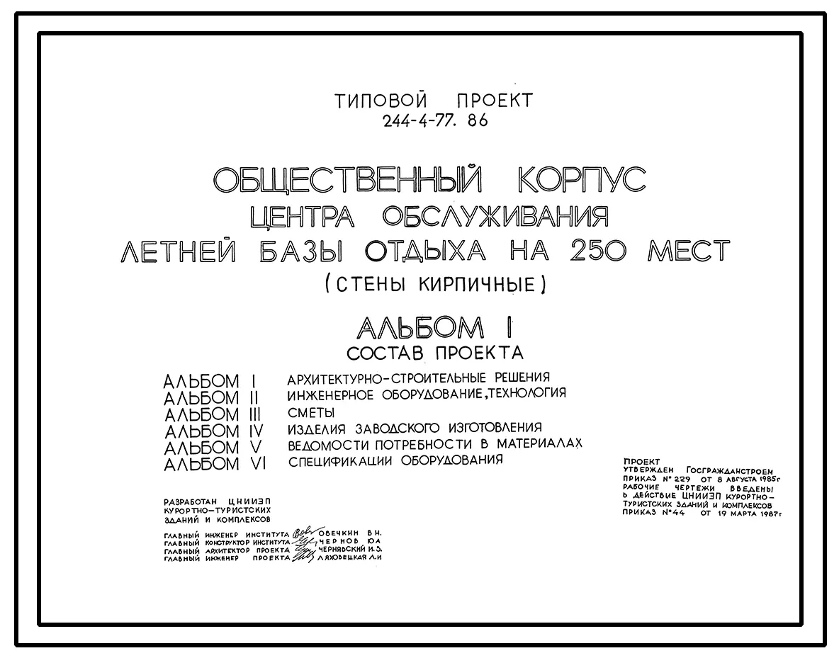 Типовой проект 244-4-77.86 Общественный корпус центра обслуживания летней базы отдыха на 250 мест (стены кирпичные)