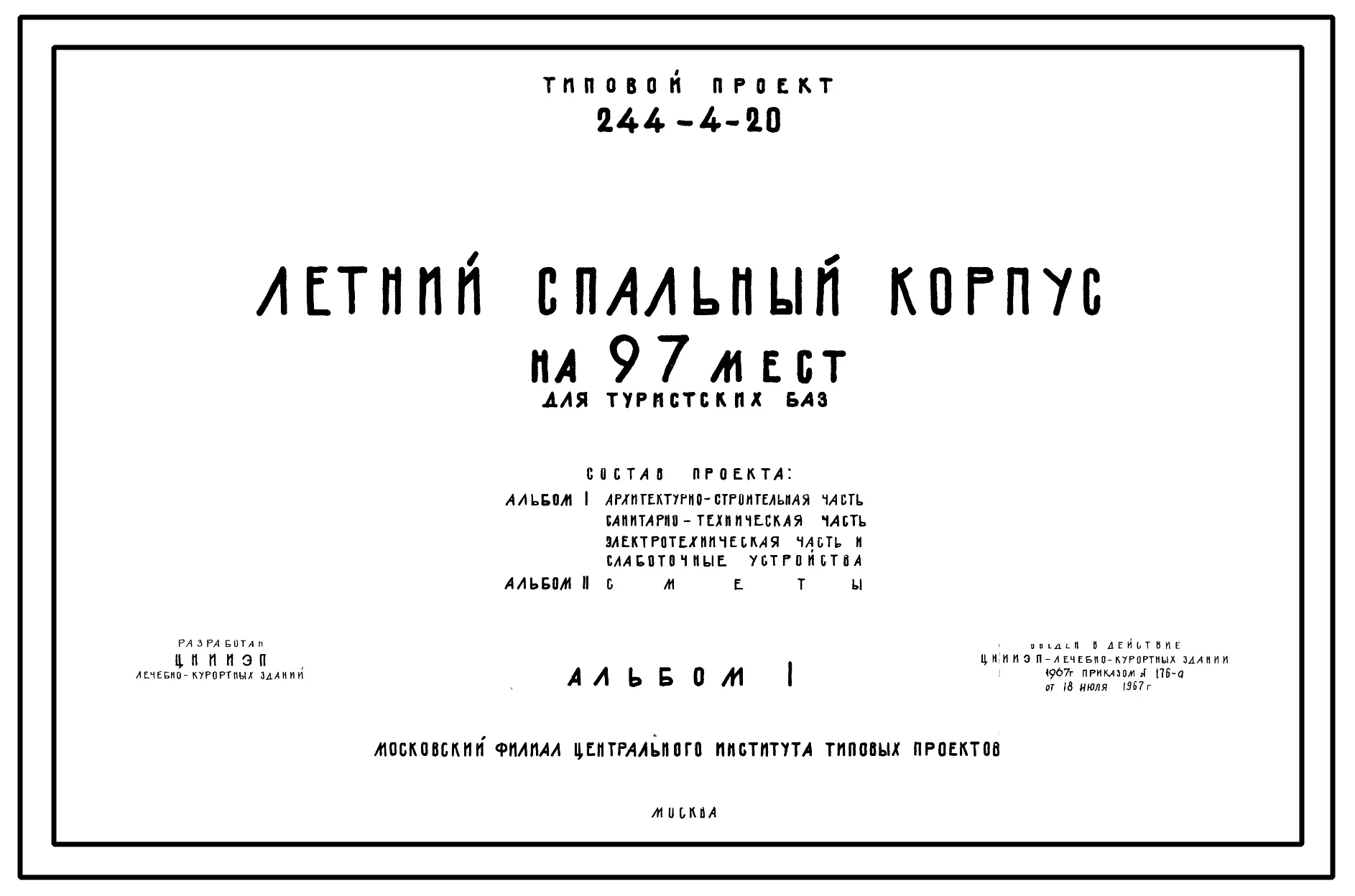 Типовой проект 244-4-20 Летний спальный корпус на 97 мест для туристических баз. Для строительства во II и III строительно-климатических зонах.