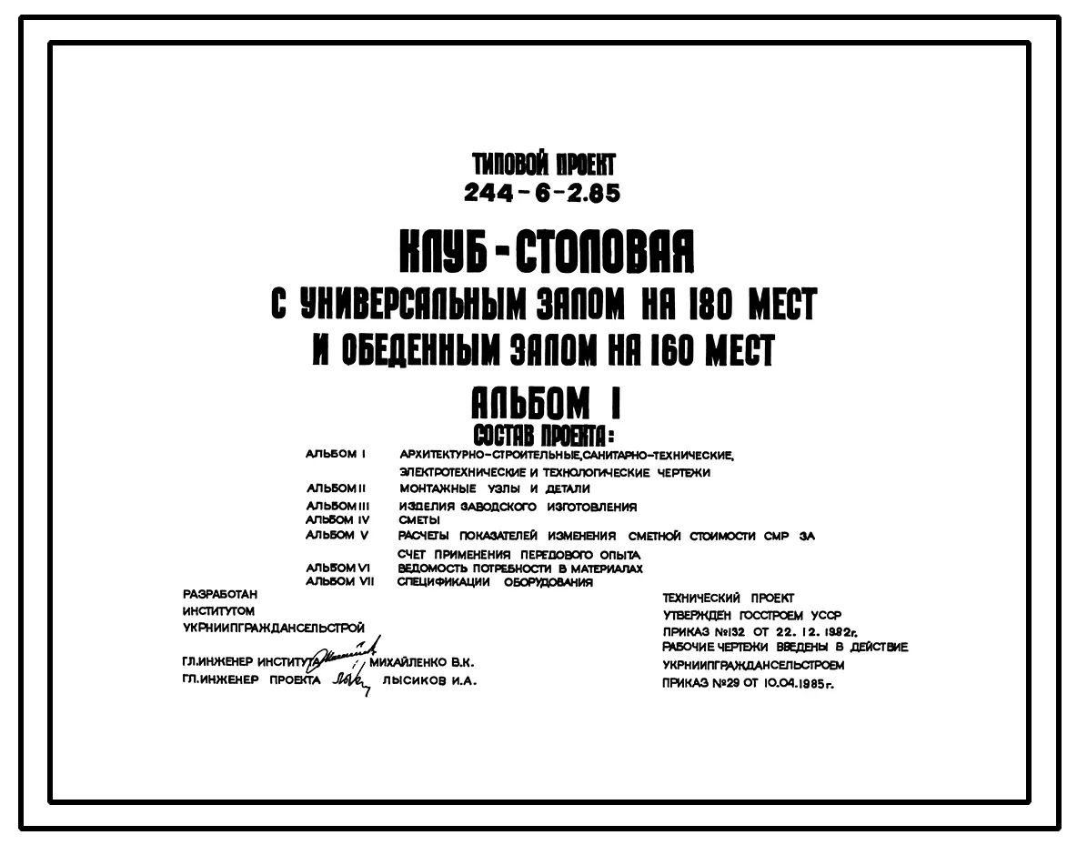 Типовой проект 244-6-2.85 Клуб-столовая с универсальным залом на 180 мест и обеденным залом на 160 мест
