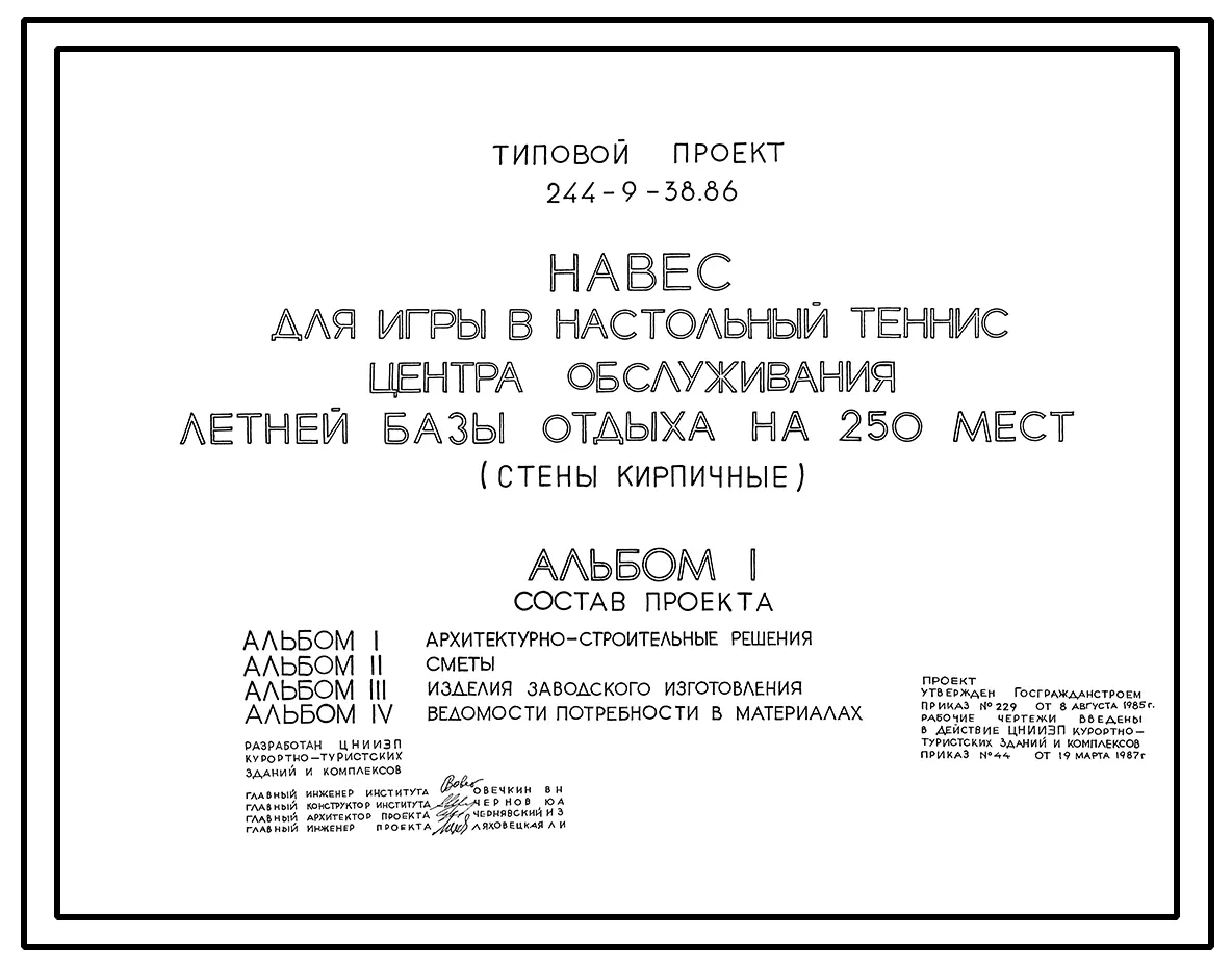 Типовой проект 244-9-38.86 Навес для игры в настольный теннис центра обслуживания летней базы отдыха на 250 мест (стены кирпичные)