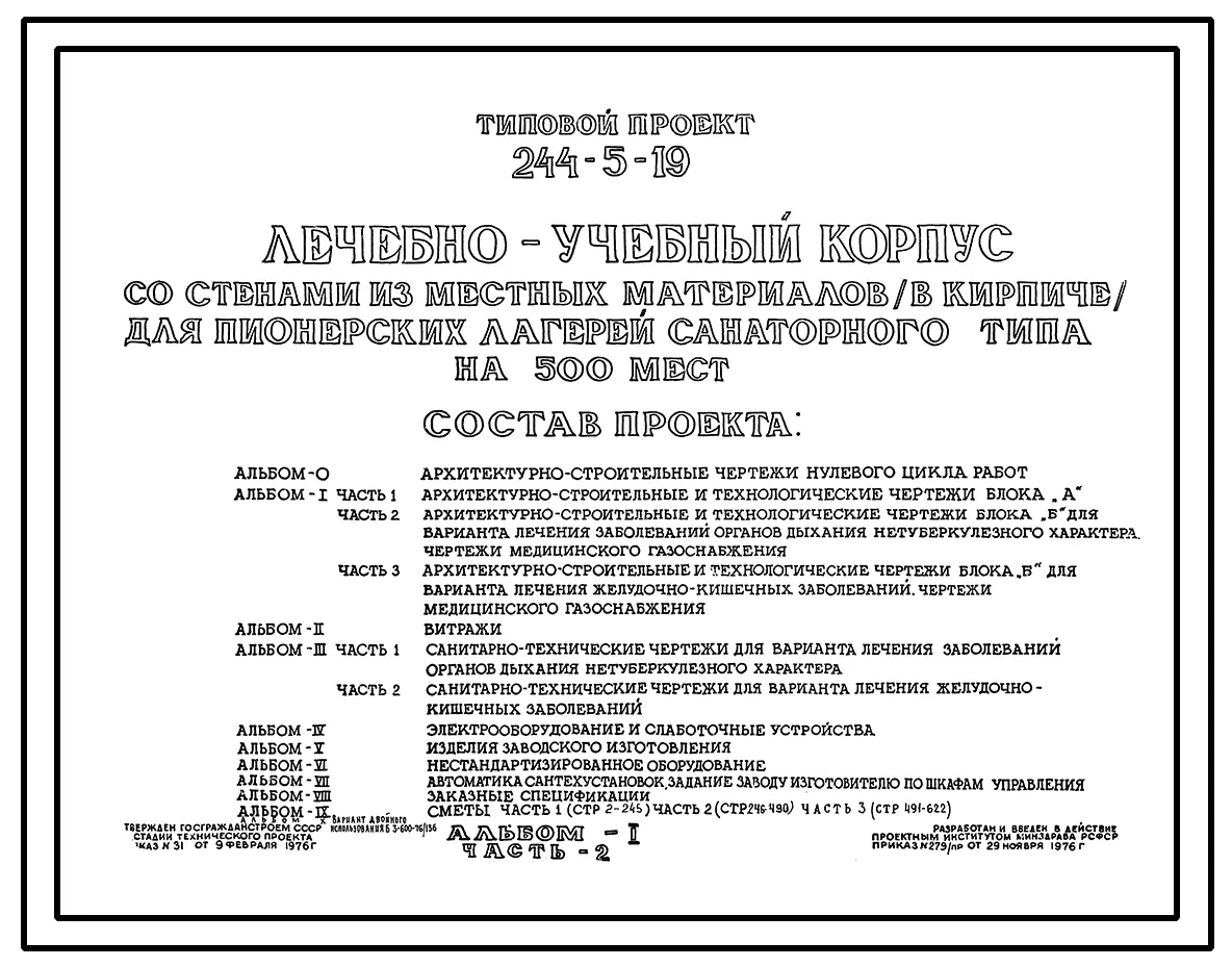 Типовой проект 244-5-19 Лечебно-учебный корпус со стенами из местных материалов (в кирпиче) для пионерских лагерей санаторного типа на 500 мест. Для строительства в IВ климатическом подрайоне, II и III климатических районах.