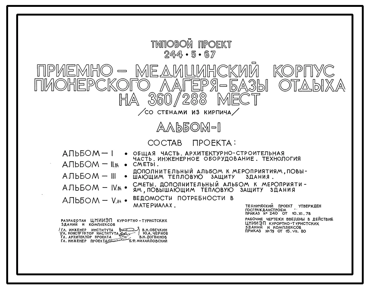 Типовой проект 244-5-67 Приемно-медицинский корпус пионерского лагеря-базы отдыха на 360/288 мест. Со стенами из кирпича. Для строительства в 1В климатическом подрайоне, 2 и 3 климатических районах