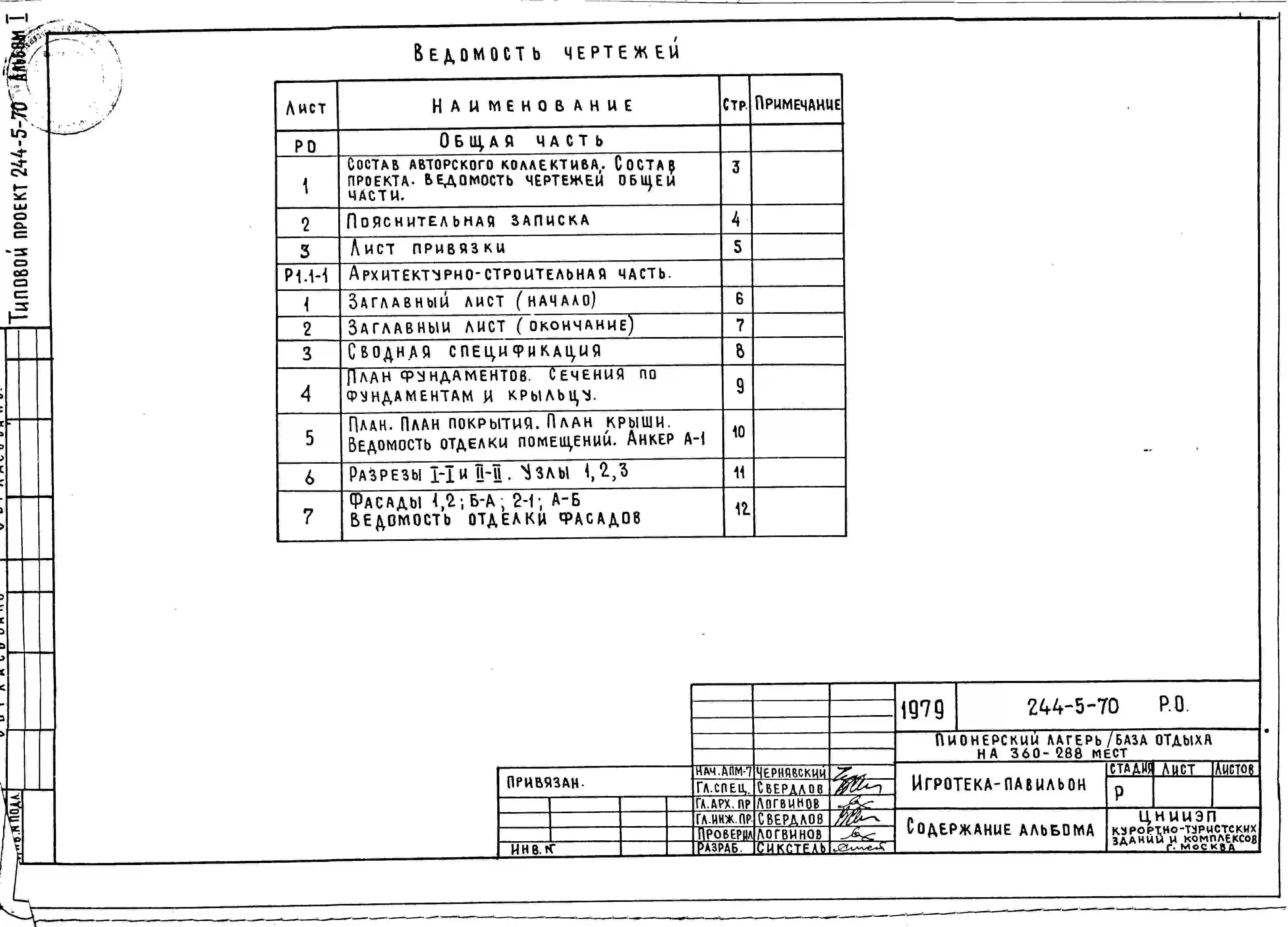 Типовой проект 244-5-70 Игротека-павильон пионерского лагеря-базы отдыха на 360-288 мест. Со стенами из кирпича. Для строительства в 1В климатическом подрайоне, 2 и 3 климатических районах