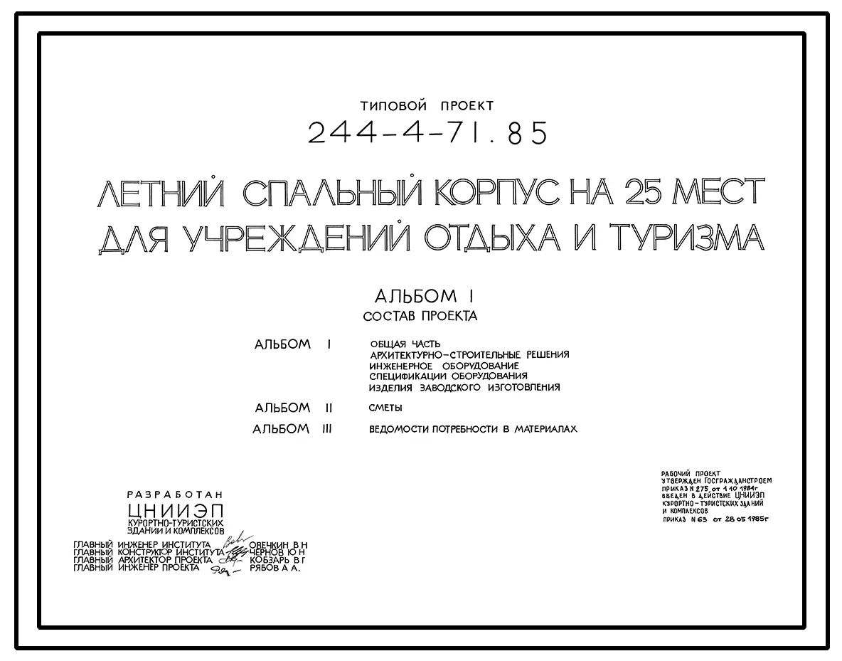 Типовой проект 244-4-71.85 Летний спальный корпус на 25 мест для учреждений отдыха и туризма. Стены из кирпича. Для строительства в 1В климатическом подрайоне, 2 и 3 климатических районах