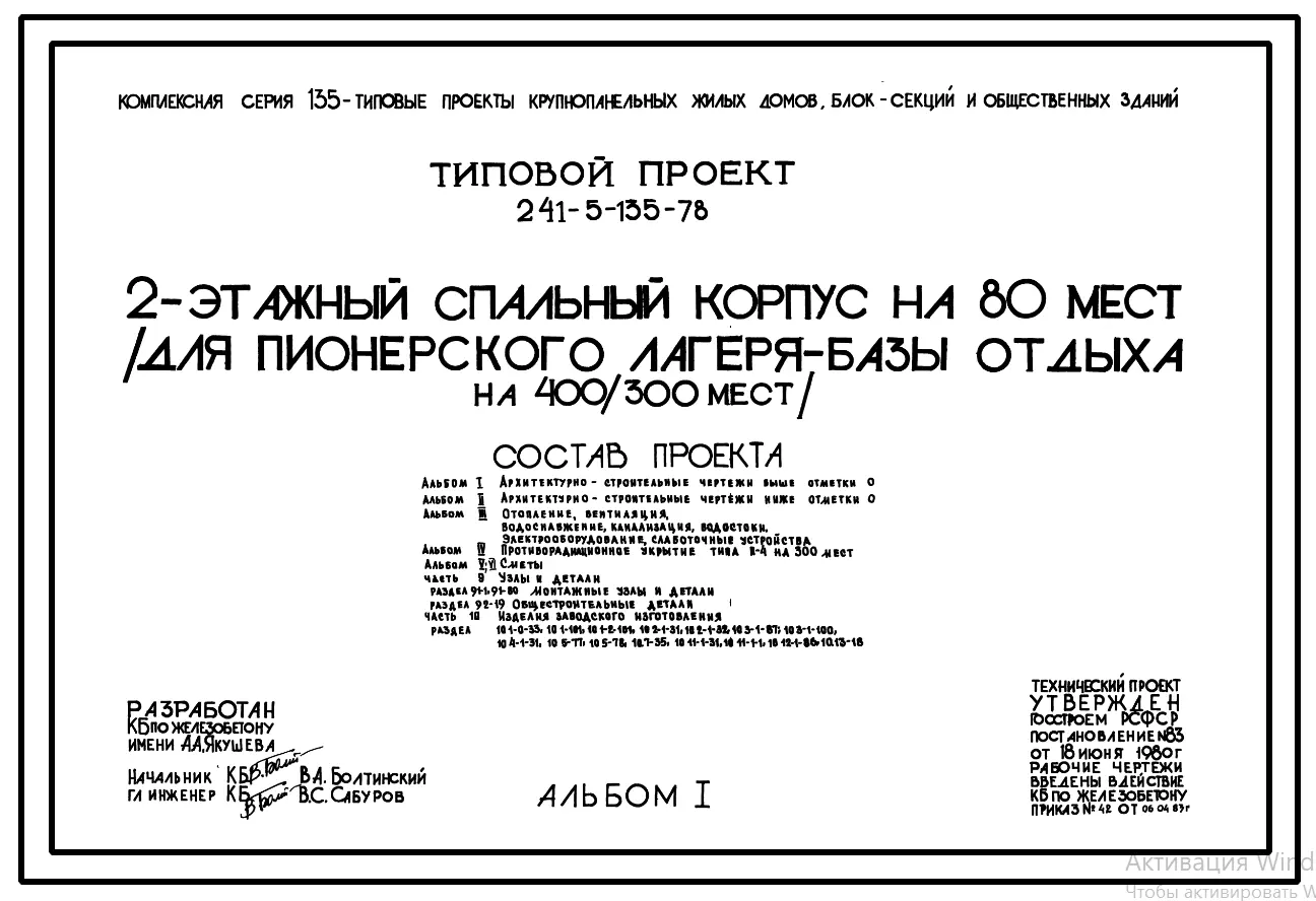Типовой проект 241-5-135-78 2-этажный спальный корпус на 80 мест (для пионерского лагеря-базы отдыха на 400/300 мест). Для строительства в 1В климатическом подрайоне, 2 и 3 климатических районах.