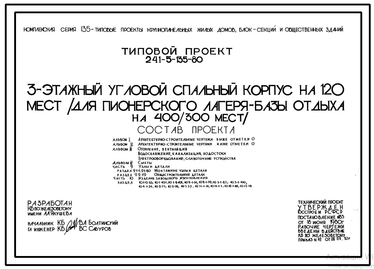Типовой проект 241-5-135-80 3-этажный угловой спальный корпус на 120 мест (для пионерского лагеря-базы отдыха на 400/300 мест). Для строительства в 1В климатическом подрайоне, 2 и 3 климатических районах.