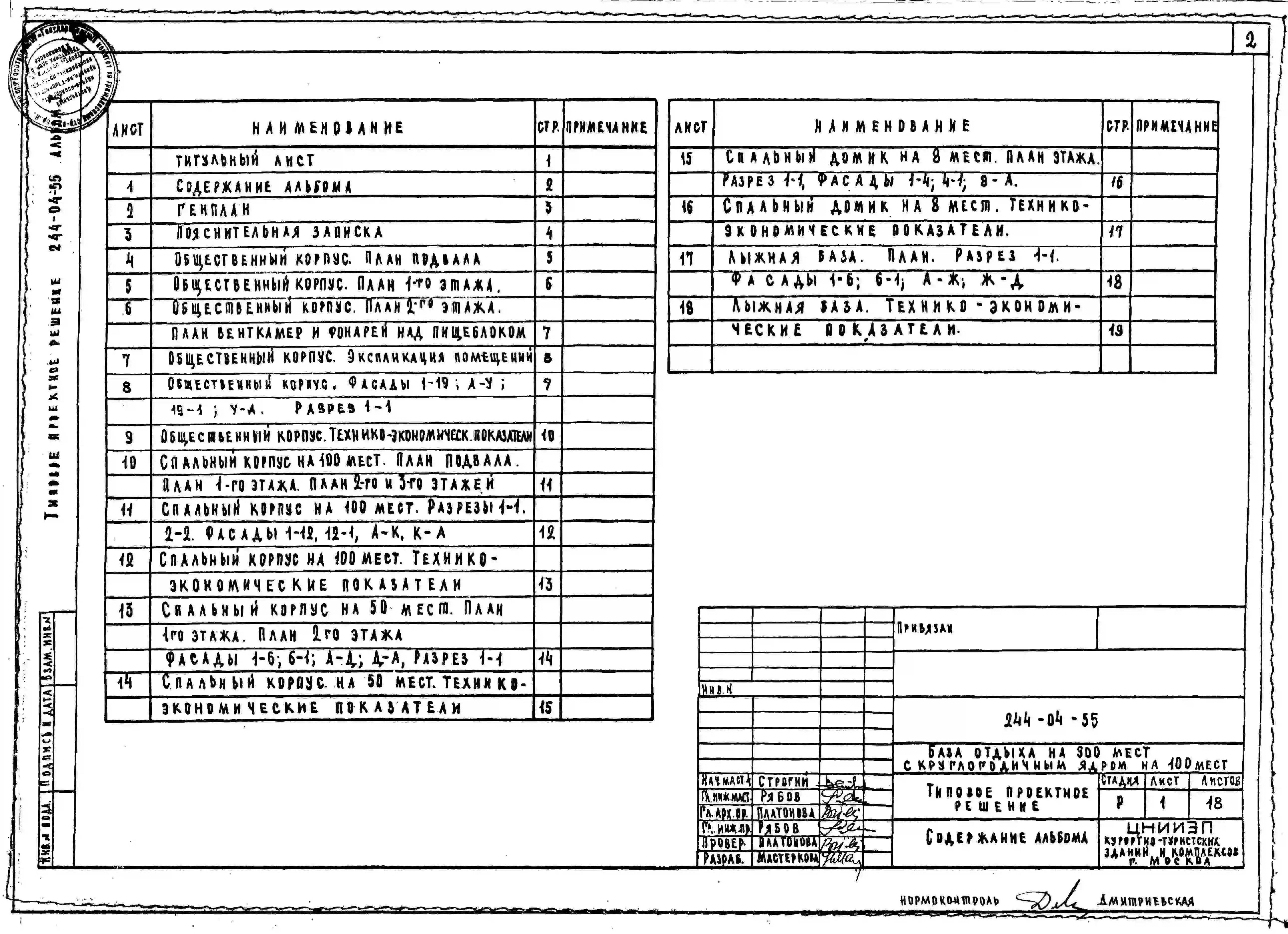 Типовой проект 244-04-55 База отдыха на 300 мест с круглогодичным ядром на 100 мест (стены из кирпича). Для строительства в 1В климатическом подрайоне, 2 и 3 климатических районах.