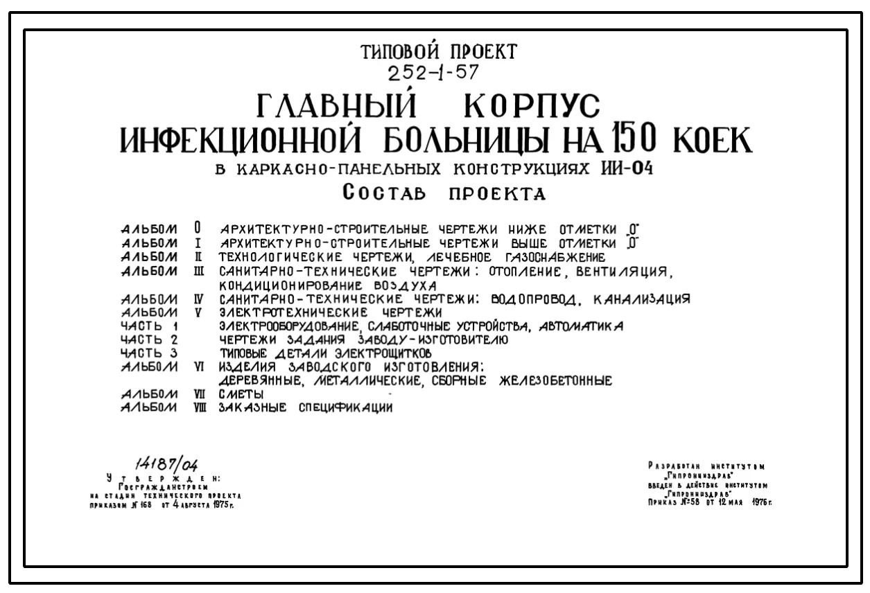 Типовой проект 252-1-57 Главный корпус инфекционной больницы на 150 коек. Здание трёхэтажное. Каркас сборный железобетонный серии ИИ-04. Стены из керамзитобетонных панелей.