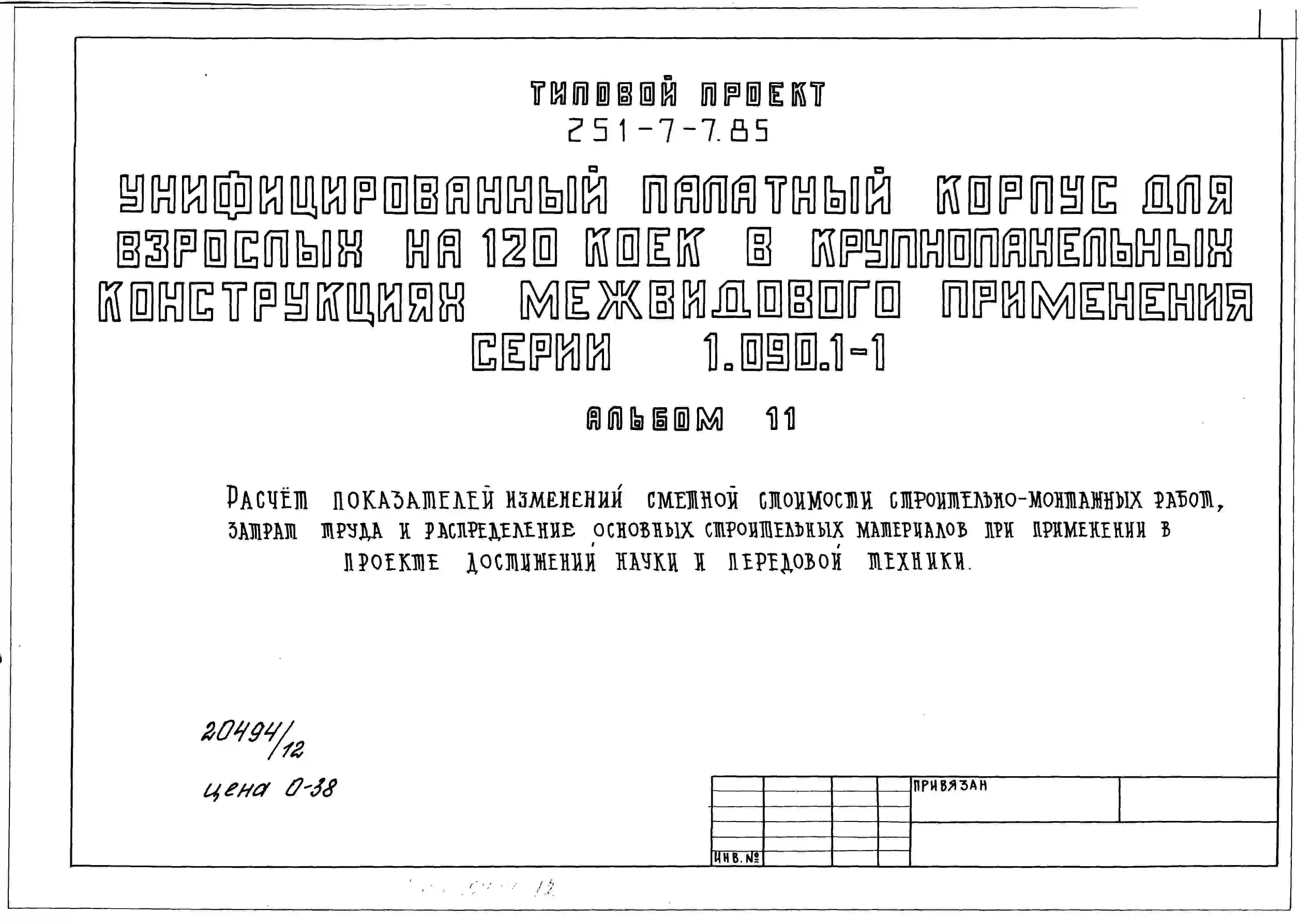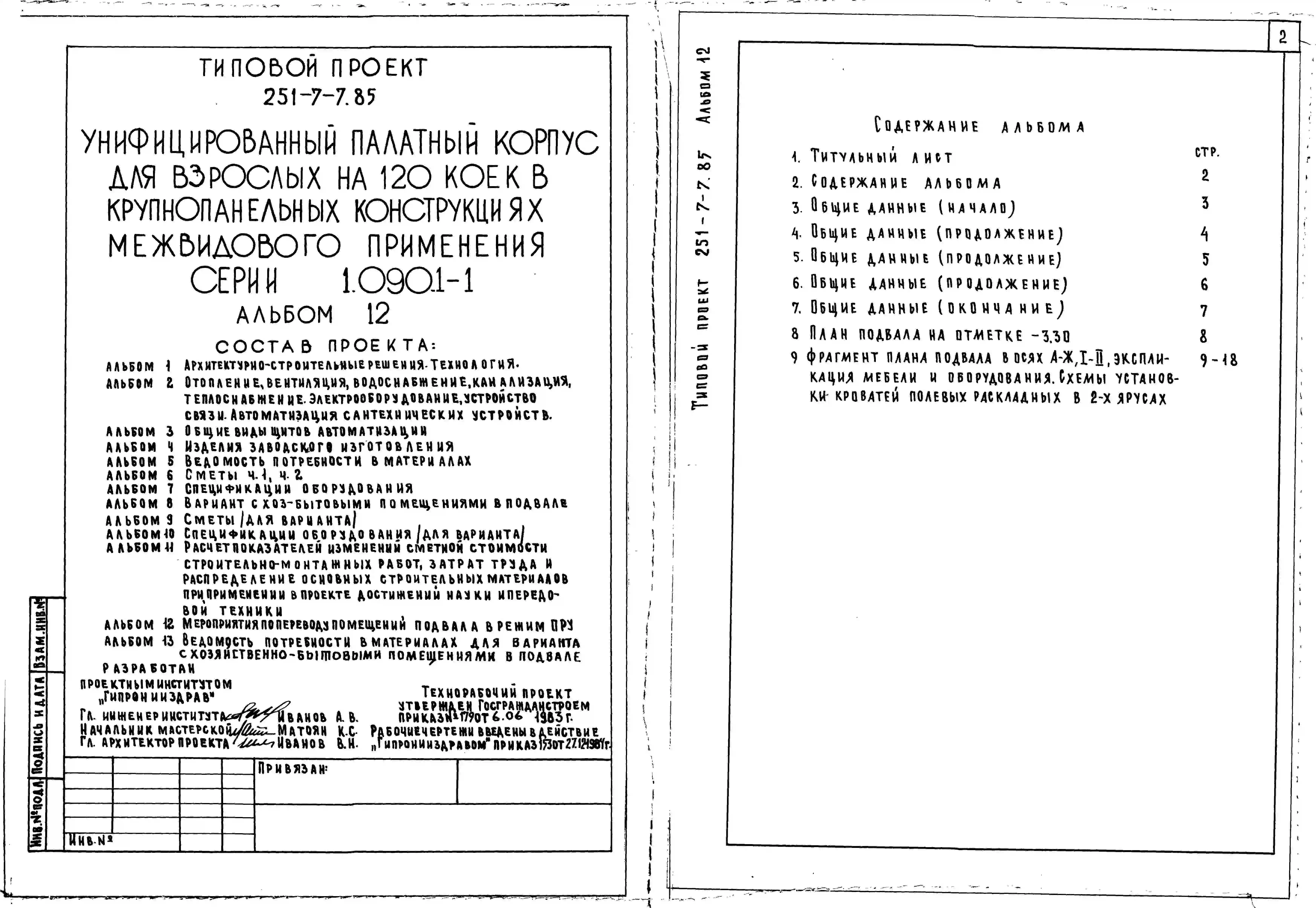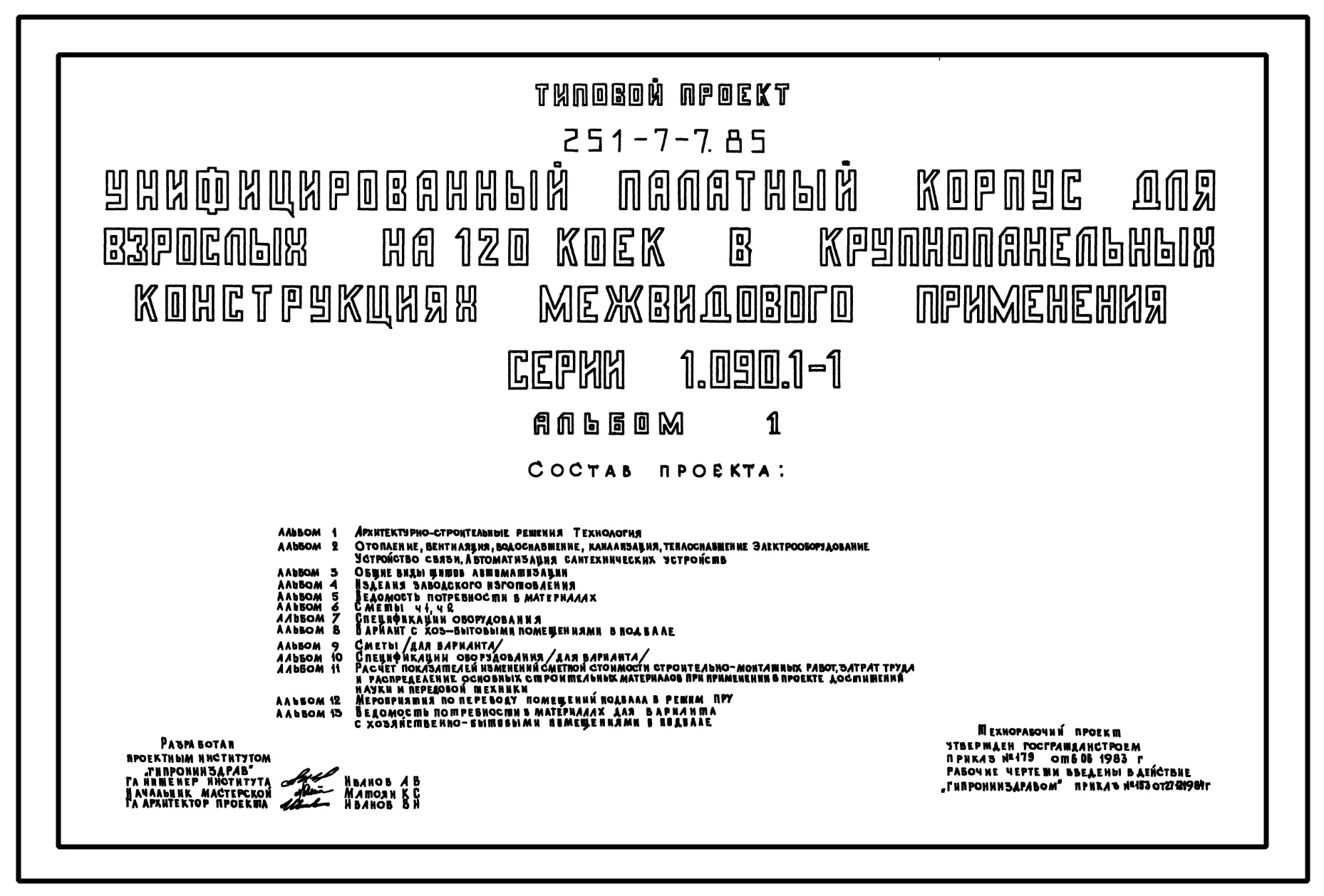 Типовой проект 251-7-7.85 Унифицированный палатный корпус для взрослых на 120 коек. Здание шестиэтажное. Стены из однослойных керамзитобетонных панелей серии 1.090.1-1.